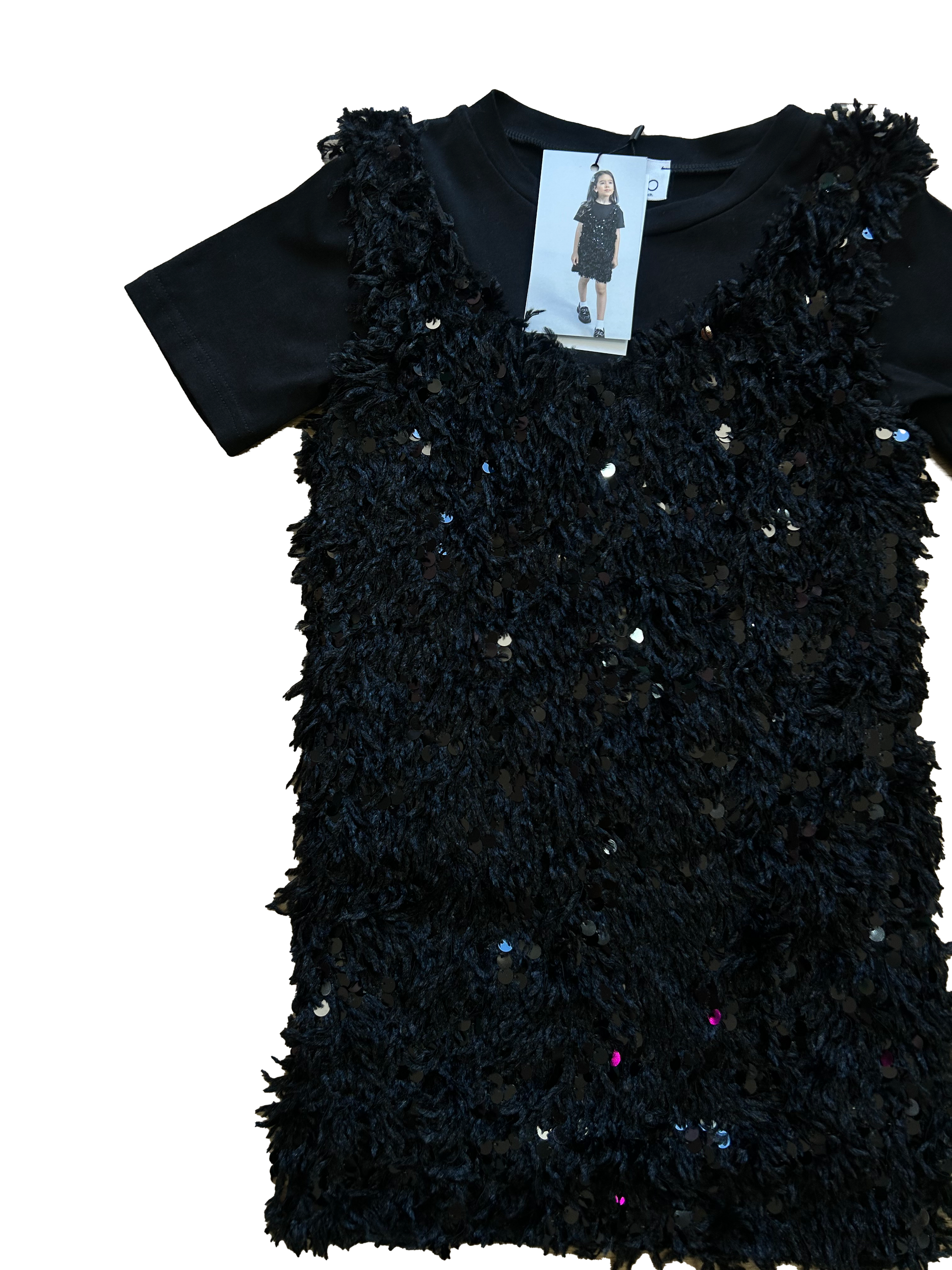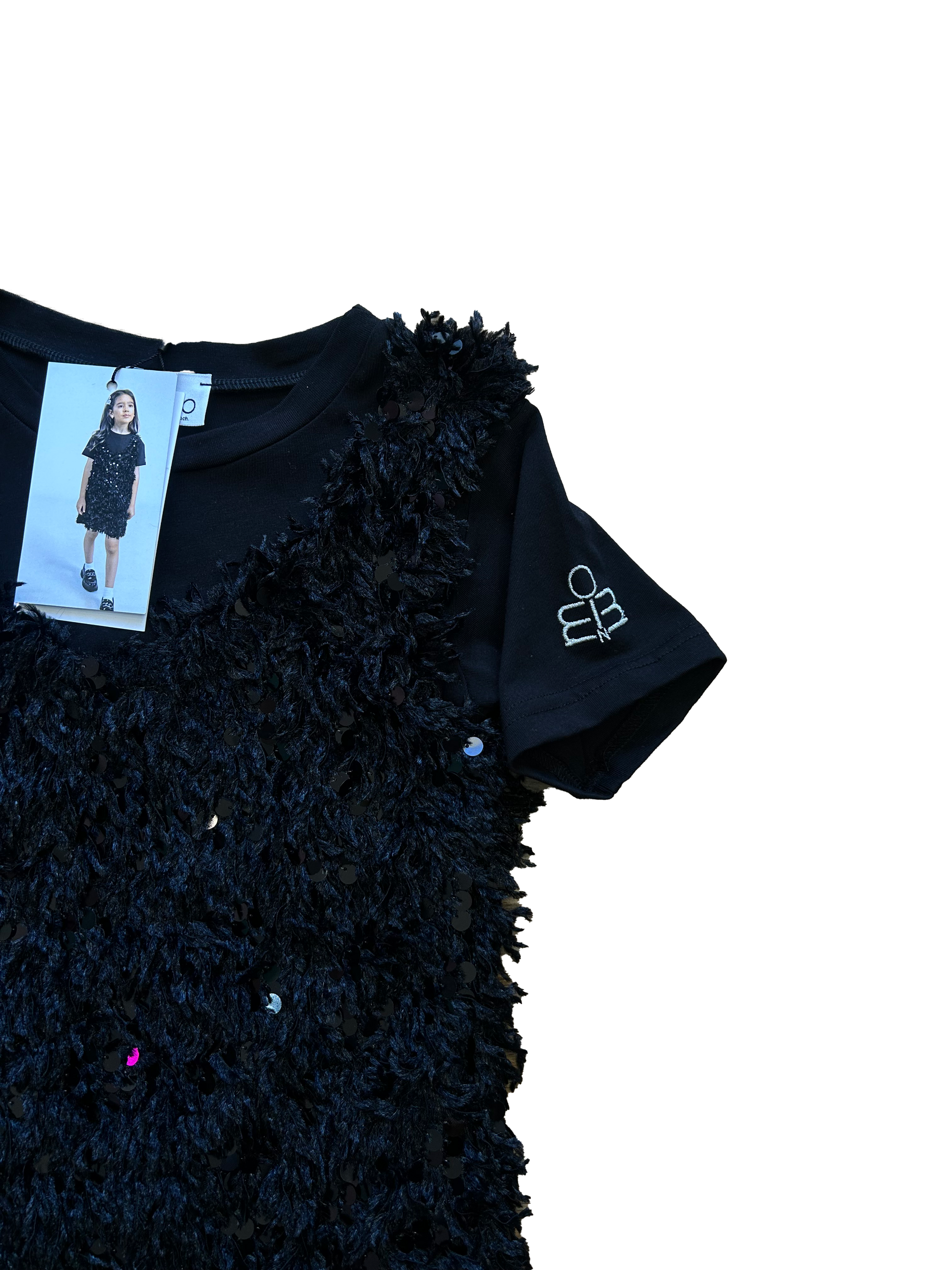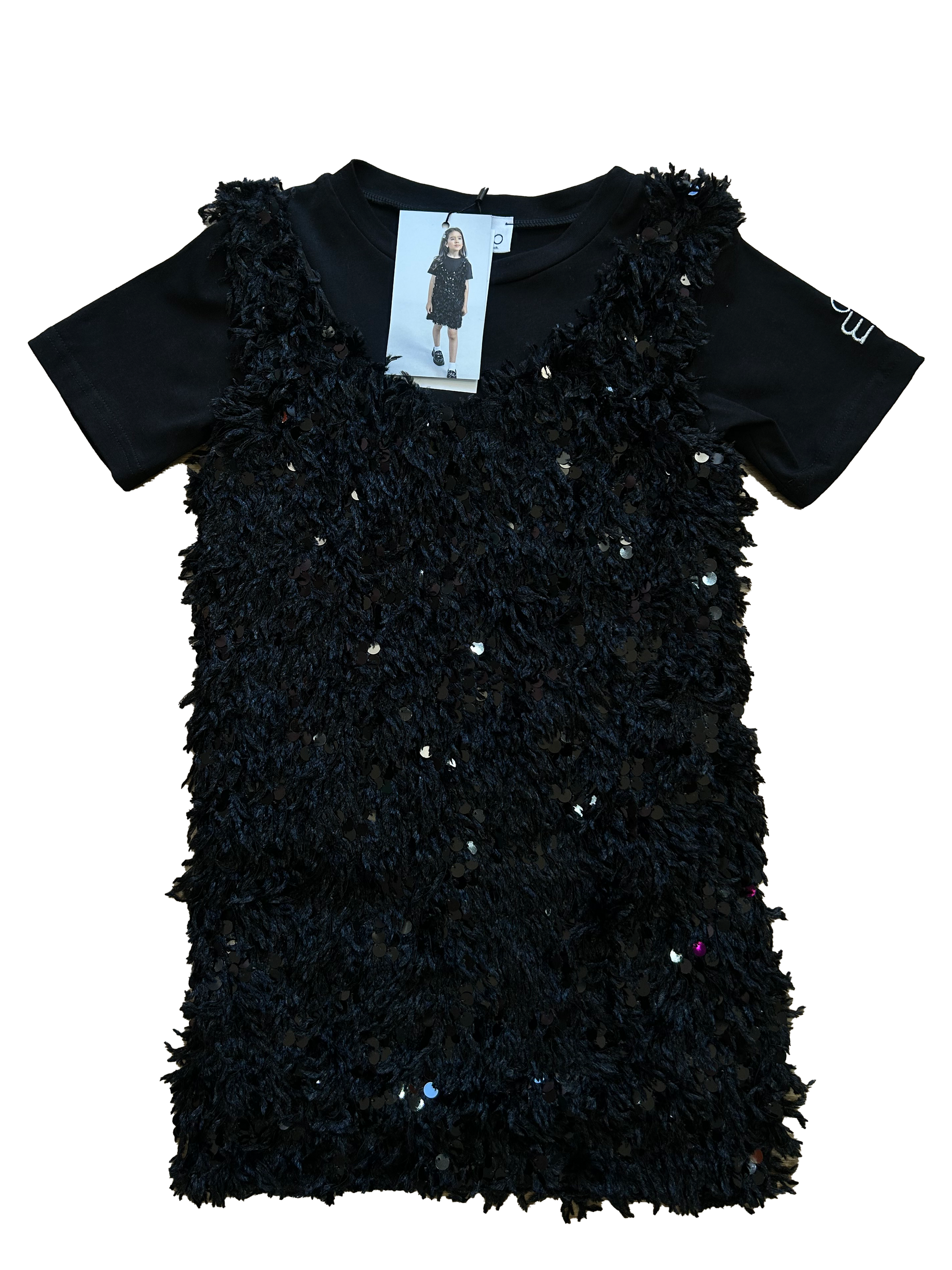 Set Minimo 2 pezzi composto da t-shirt mezza manica nera con logo sul braccio e abitino impreziosito da piume e paillettes(internamente foderato.