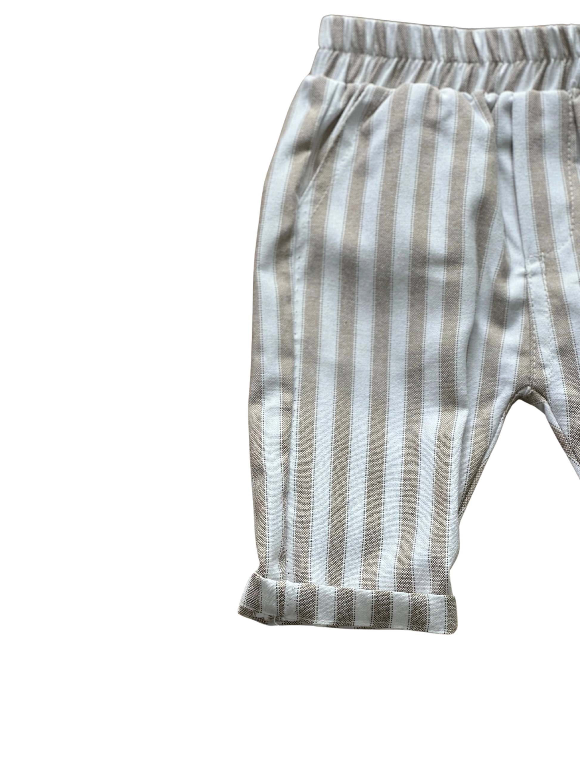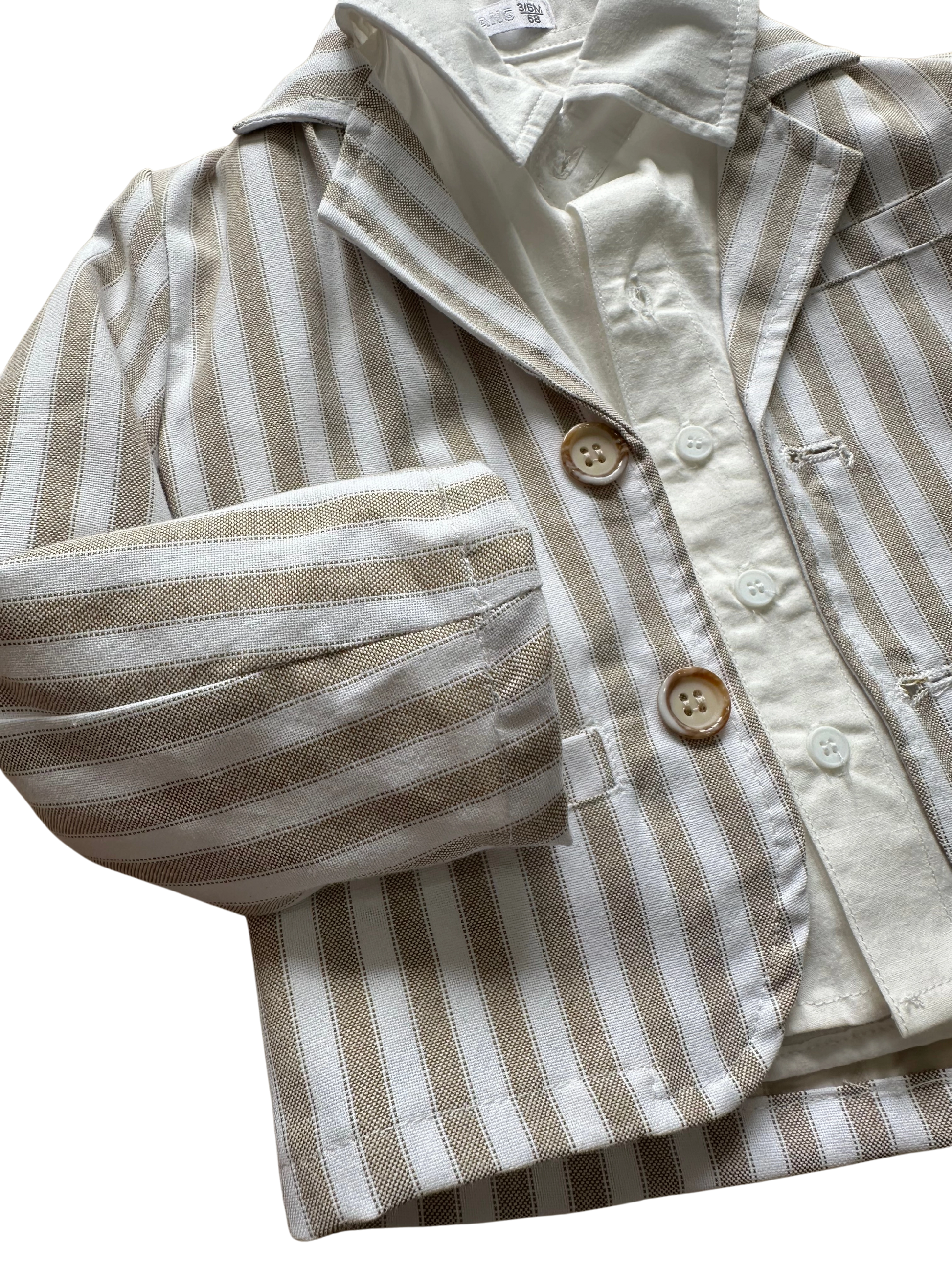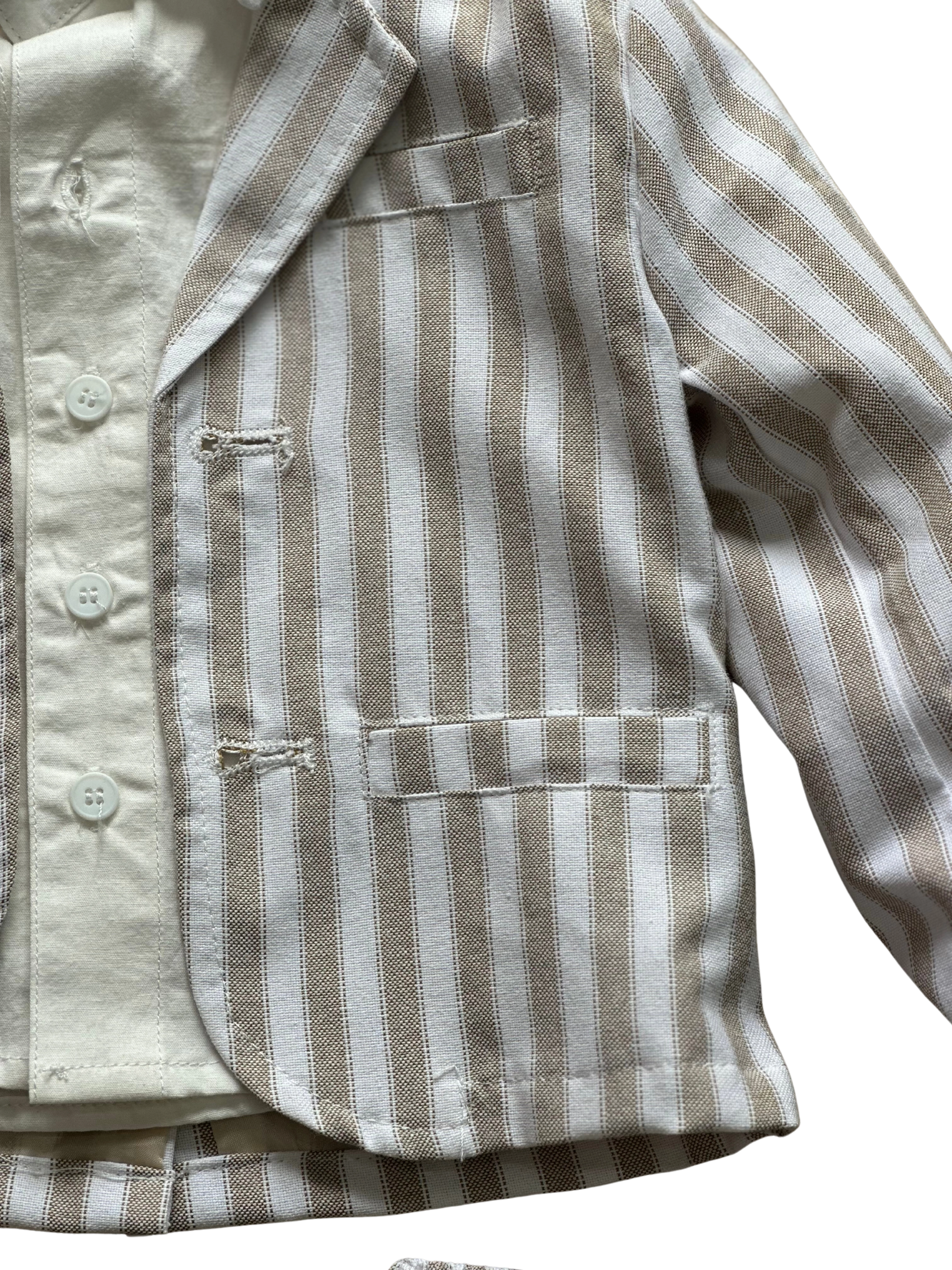 Abito Baby Gang a righe bianco e beige composto da : Giacca a righe, camicia bianca manica lunga, papillon a righe, pantone con elastico in vita e tasca a filo a righe.