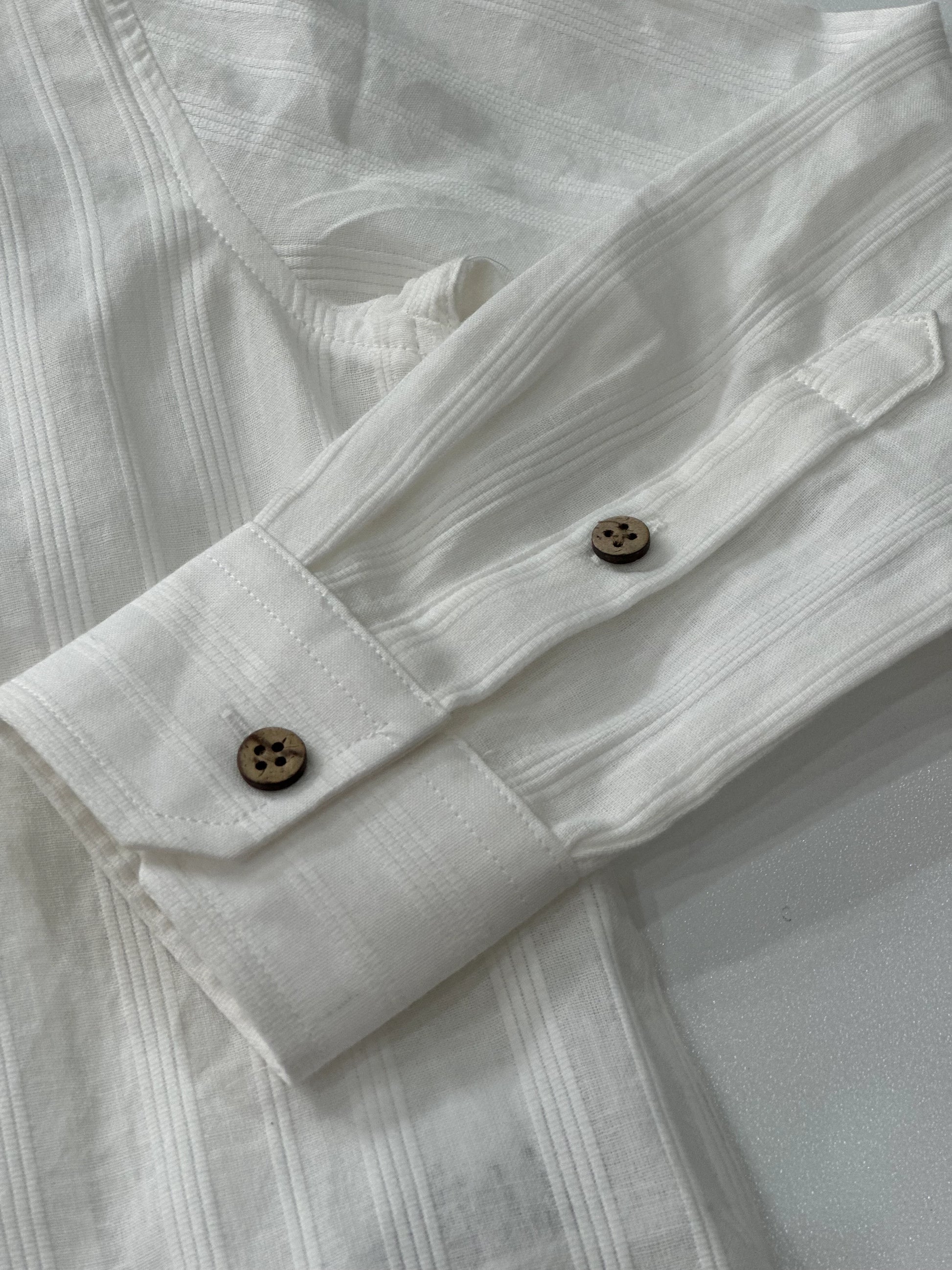 Camicia Yclu bianca con colletto coreano, raffinata lavorazione a righe in rilievo tono su tono, e bottoncini in legno. Un insieme di elementi che donano un effetto unico ed elegante.