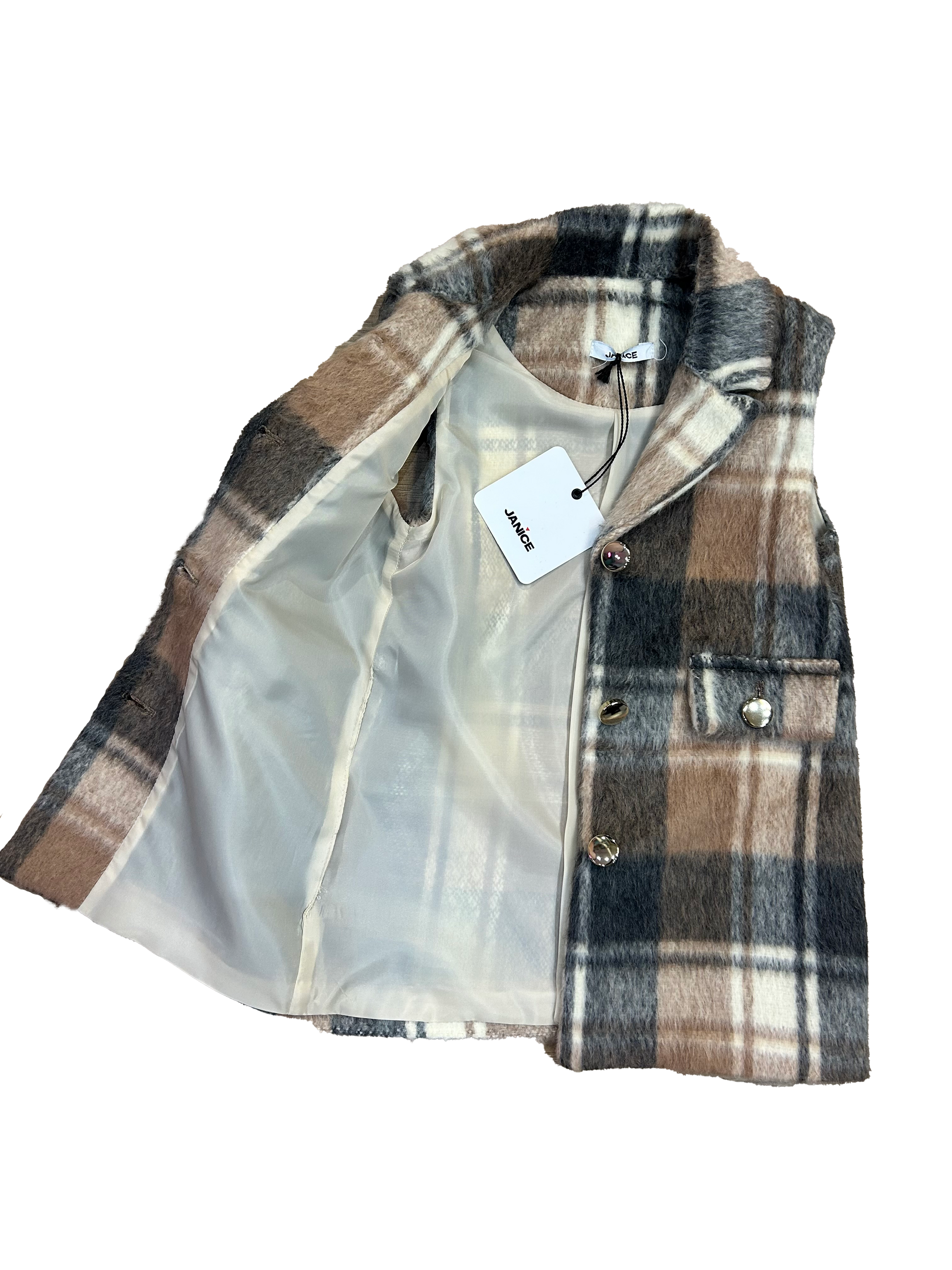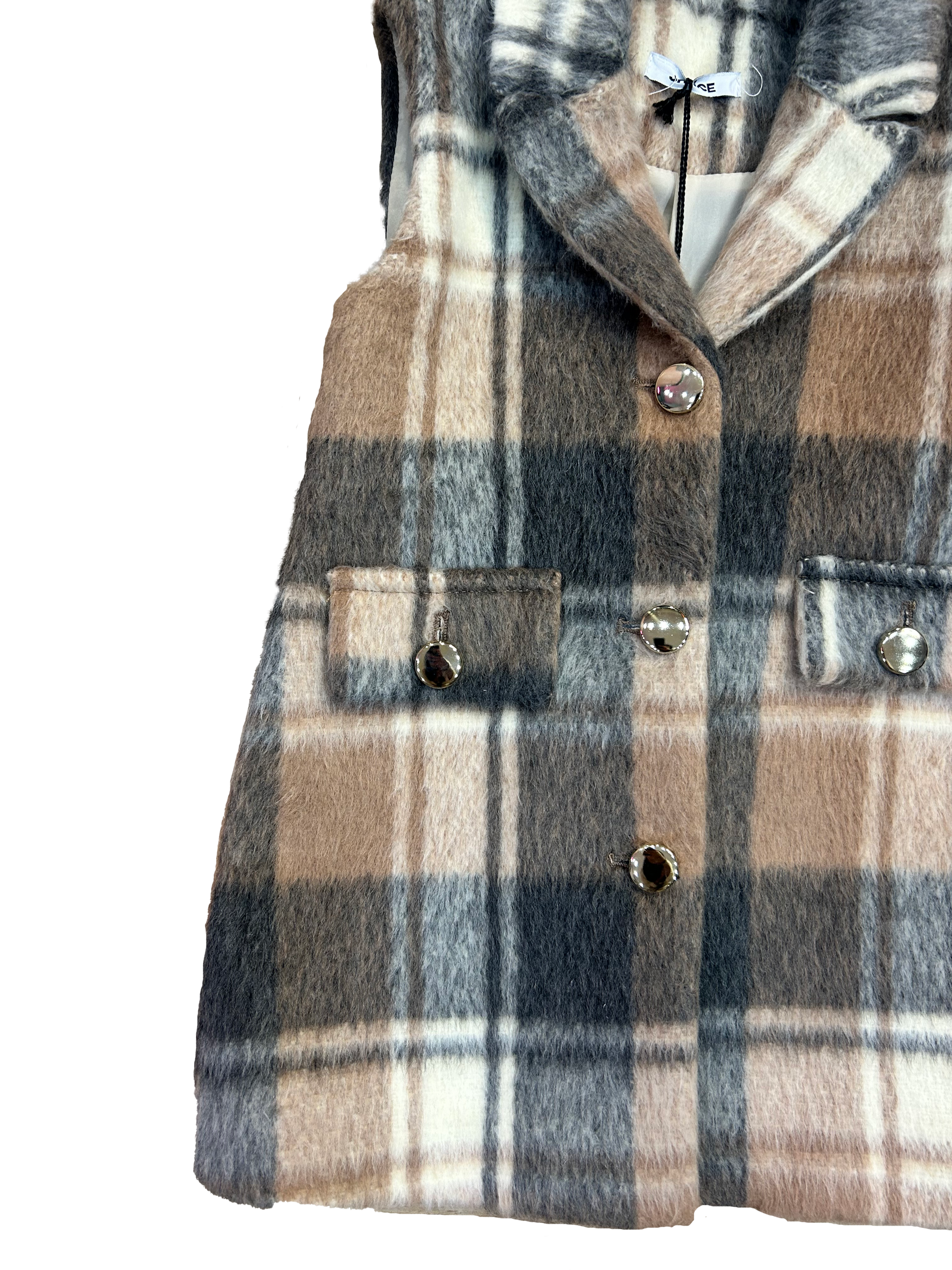 Cappottino Janice in fantasia check sui toni del marrone, con bottoni dorati e taglio a giro maniche. Grazie alla sua lunghezza elegante, può essere indossato sia come cappottino che come vestitino con una calzamaglia nei giorni più freddi.