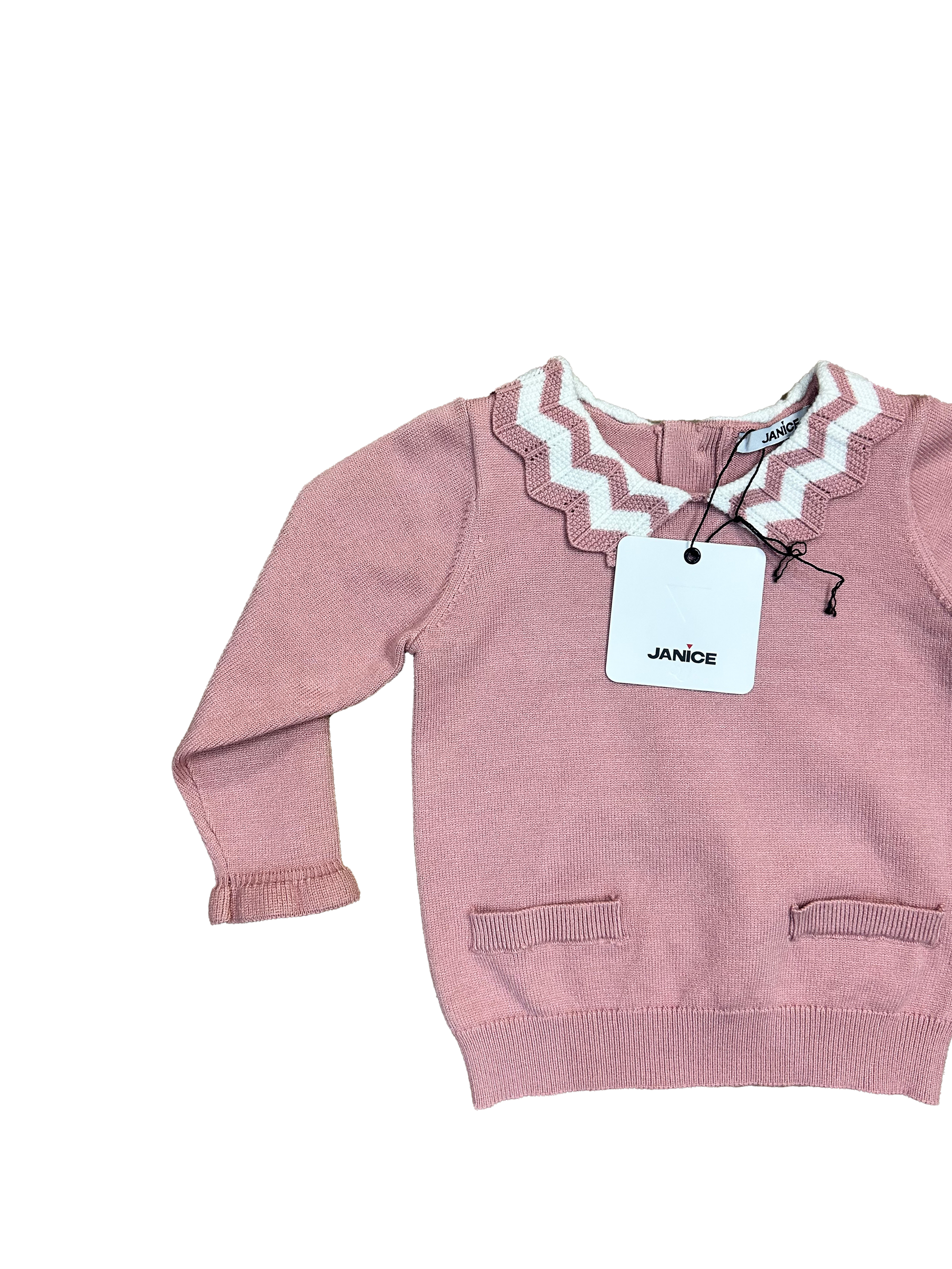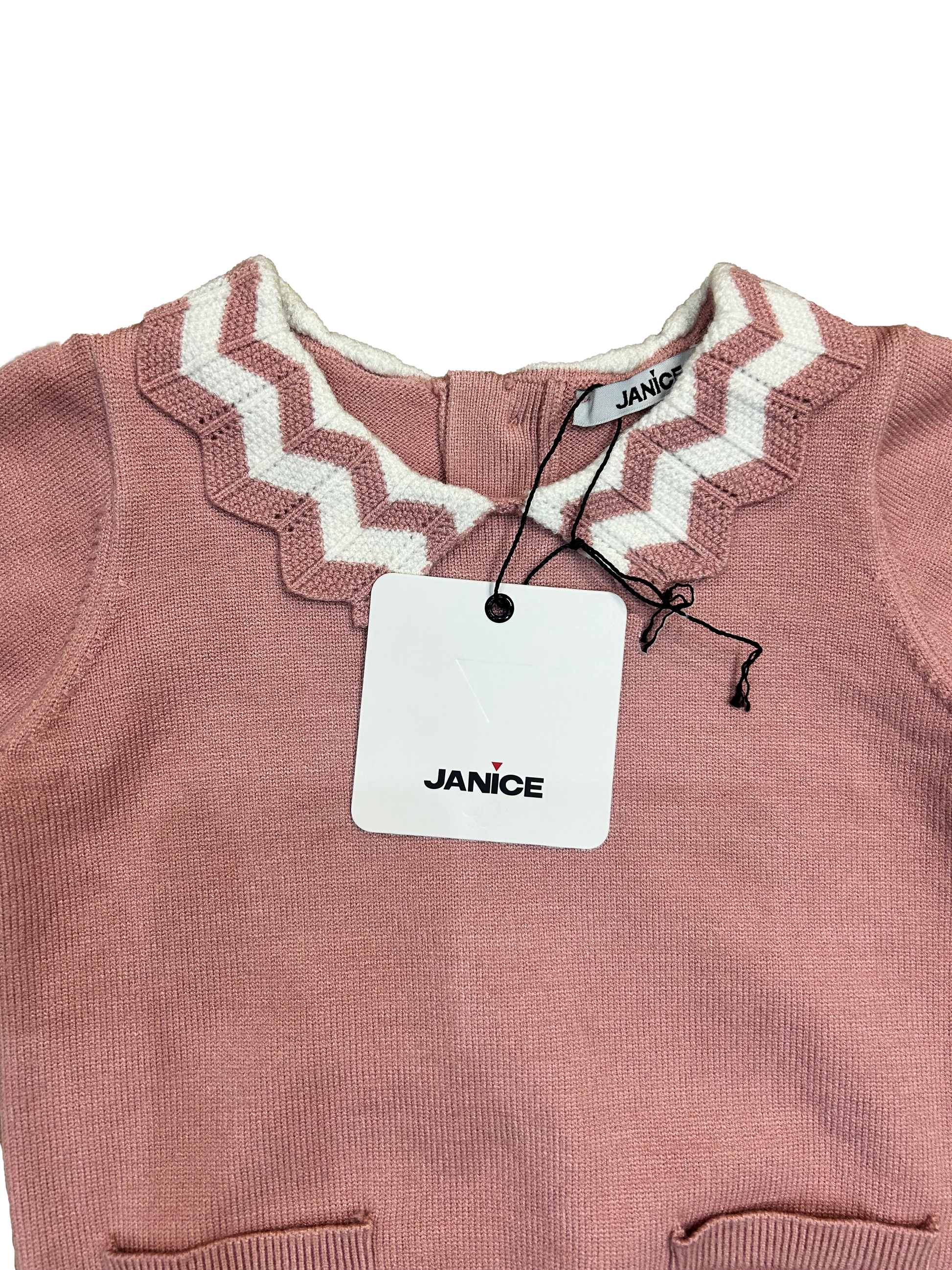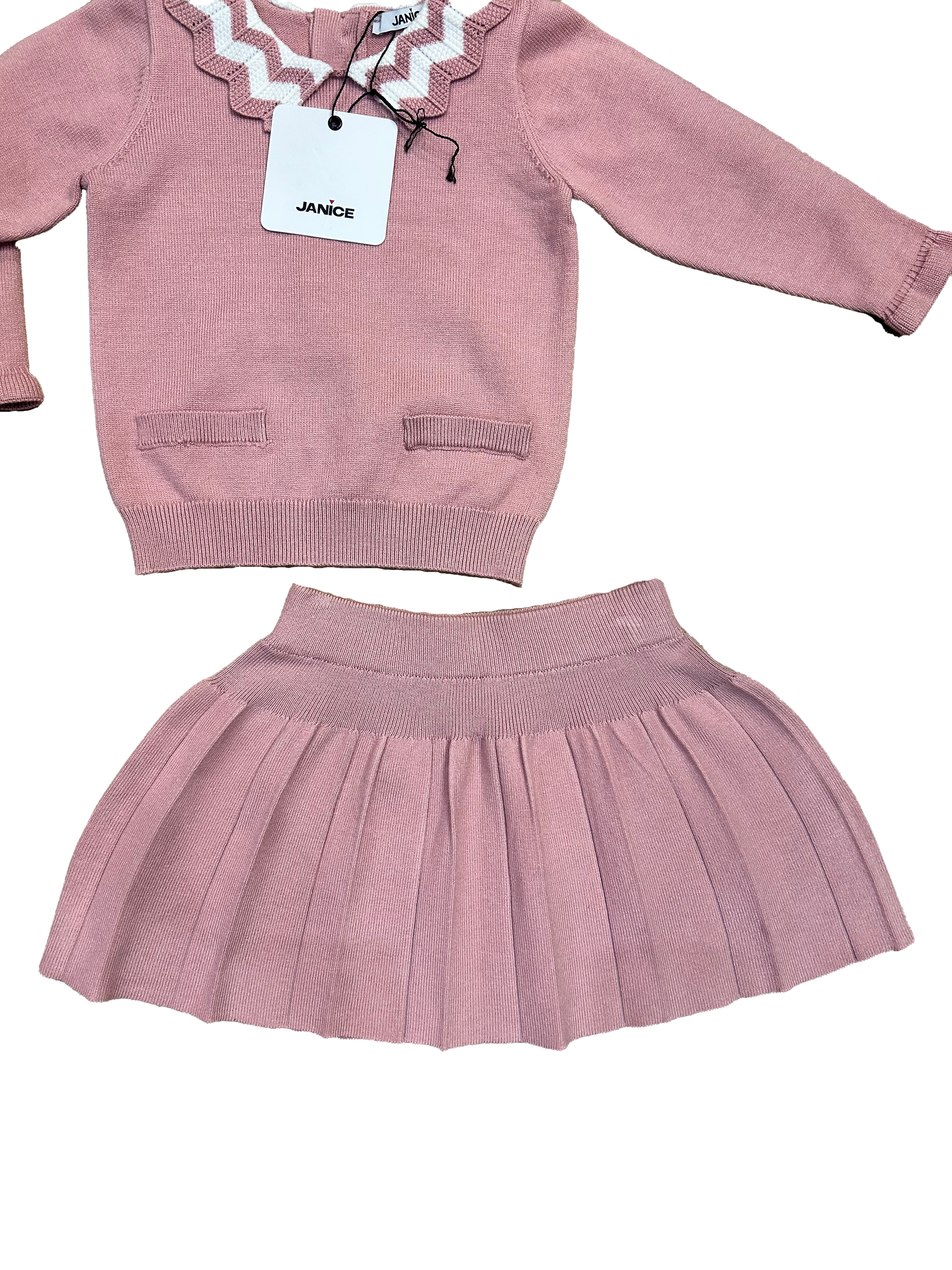 Raffinato completo Janice in maglia, composto da pull con colletto e dettagli bianchi, bottoncini sul retro, finte taschine sul davanti e maniche con rouches. La gonnellina a pieghe completa il look con un tocco elegante e senza tempo.