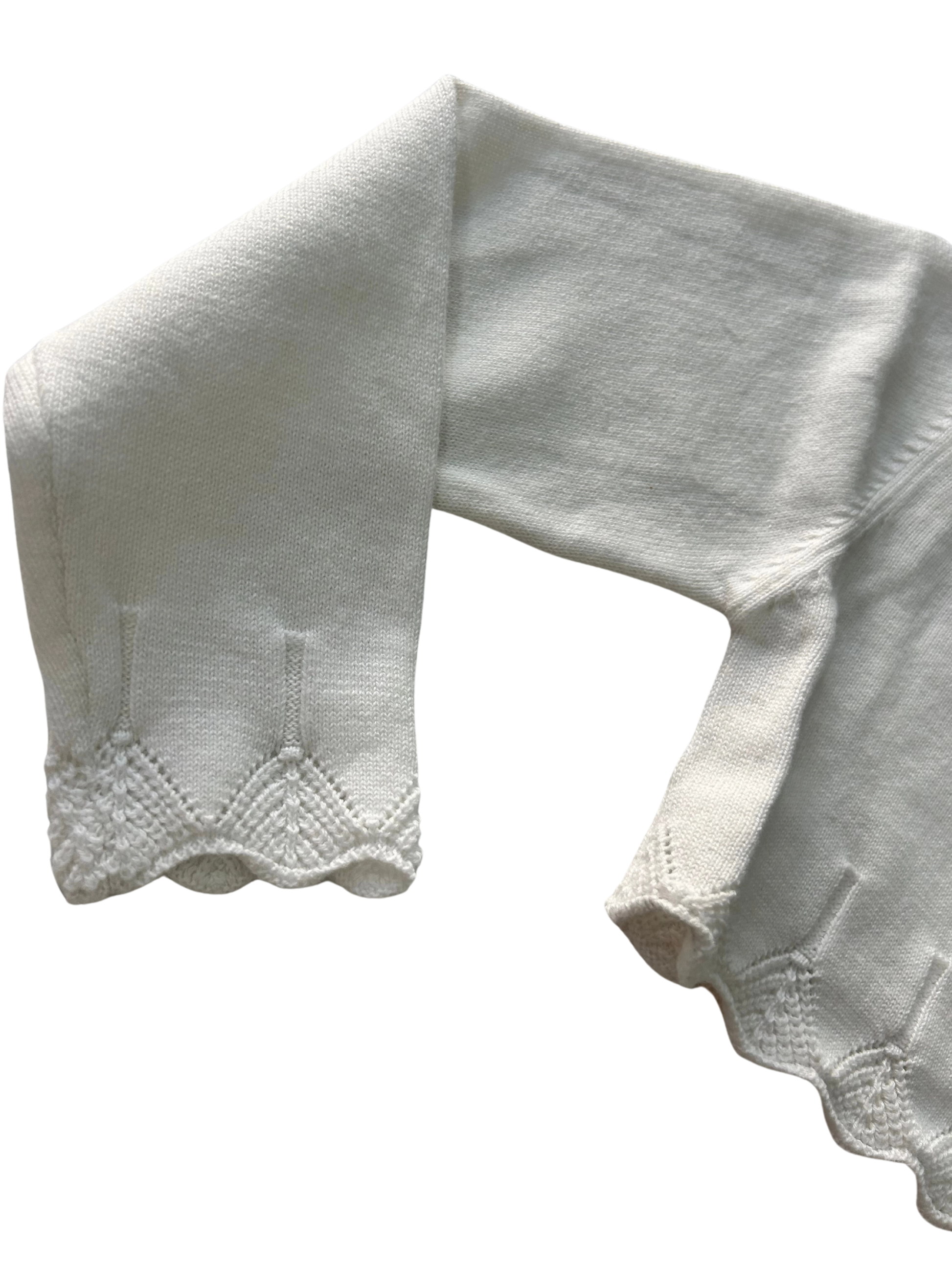 Coprispalle Last Planet bianco, con bottoncino al collo e inserti a punto traforato con motivo smerlato sul fondo e sulle maniche.