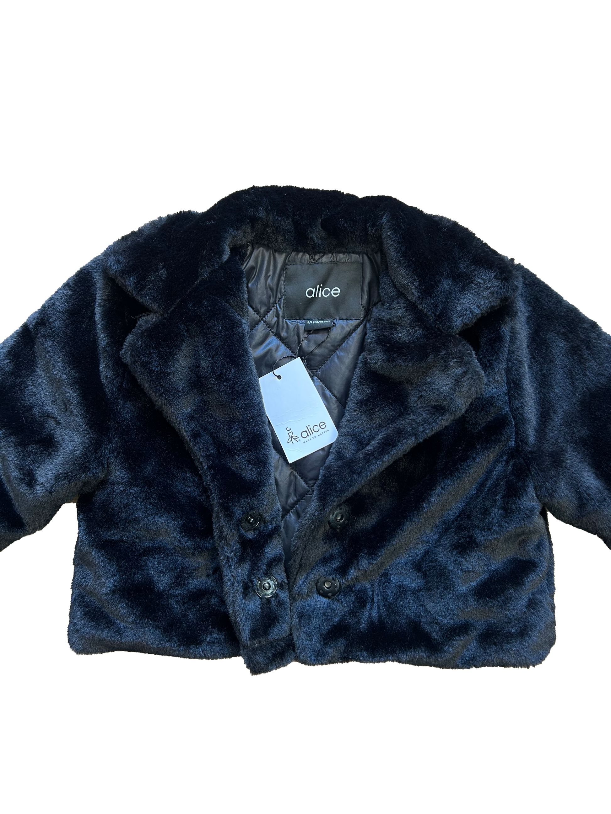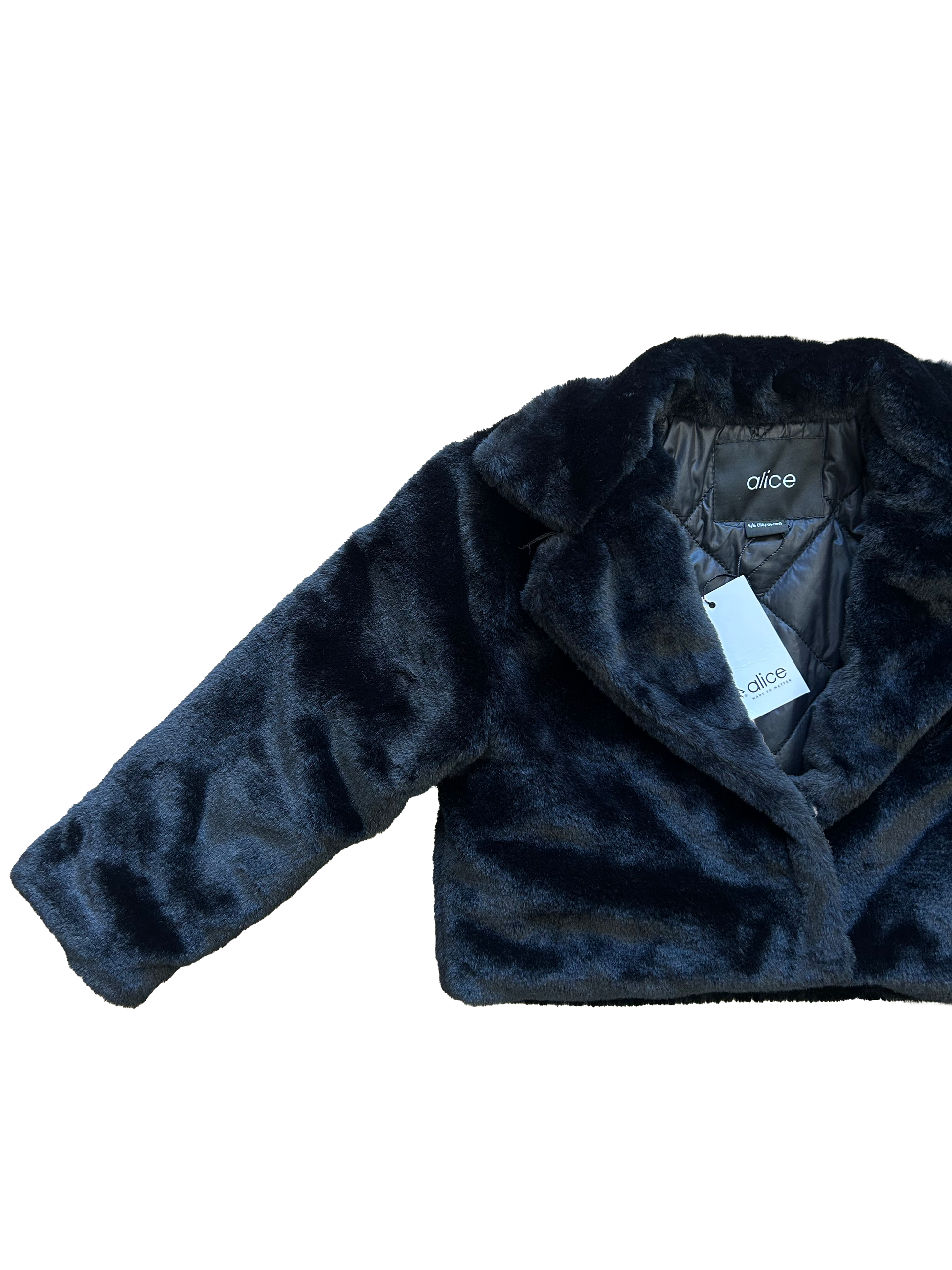 Ecopelliccia Alice nera rasata, dal taglio leggermente crop che la rende moderna e super alla moda. Presenta chiusura frontale con bottoni e interno trapuntato e foderato per garantire calore e comfort durante i mesi freddi.