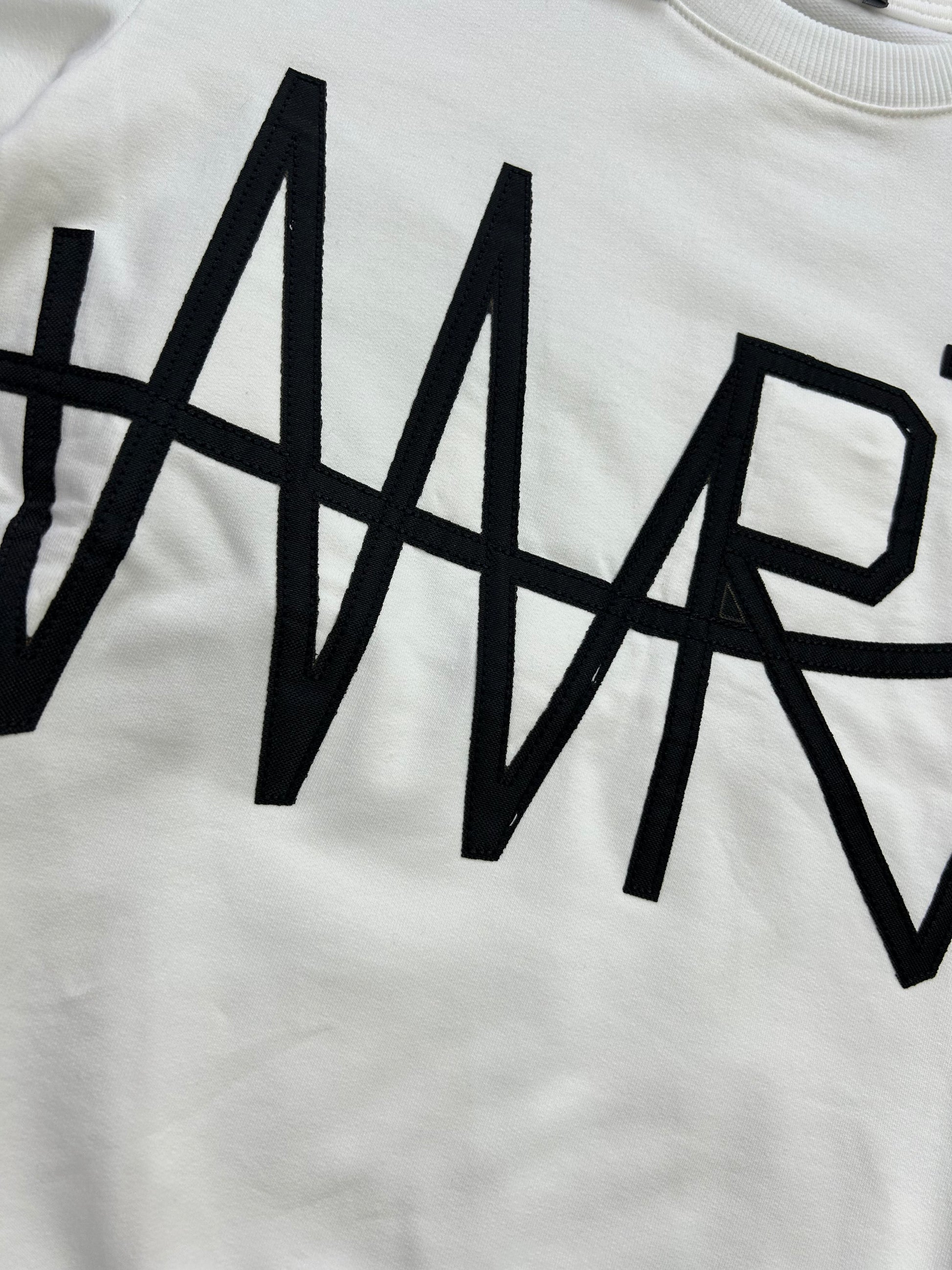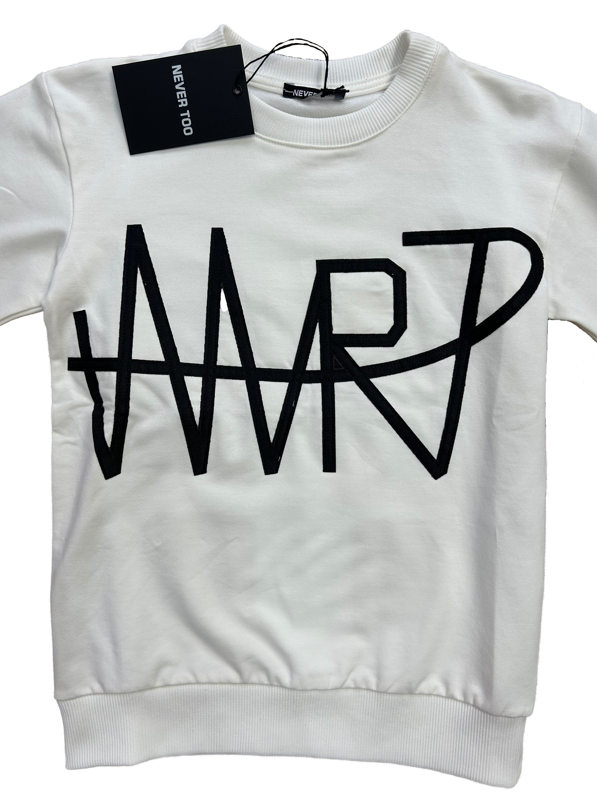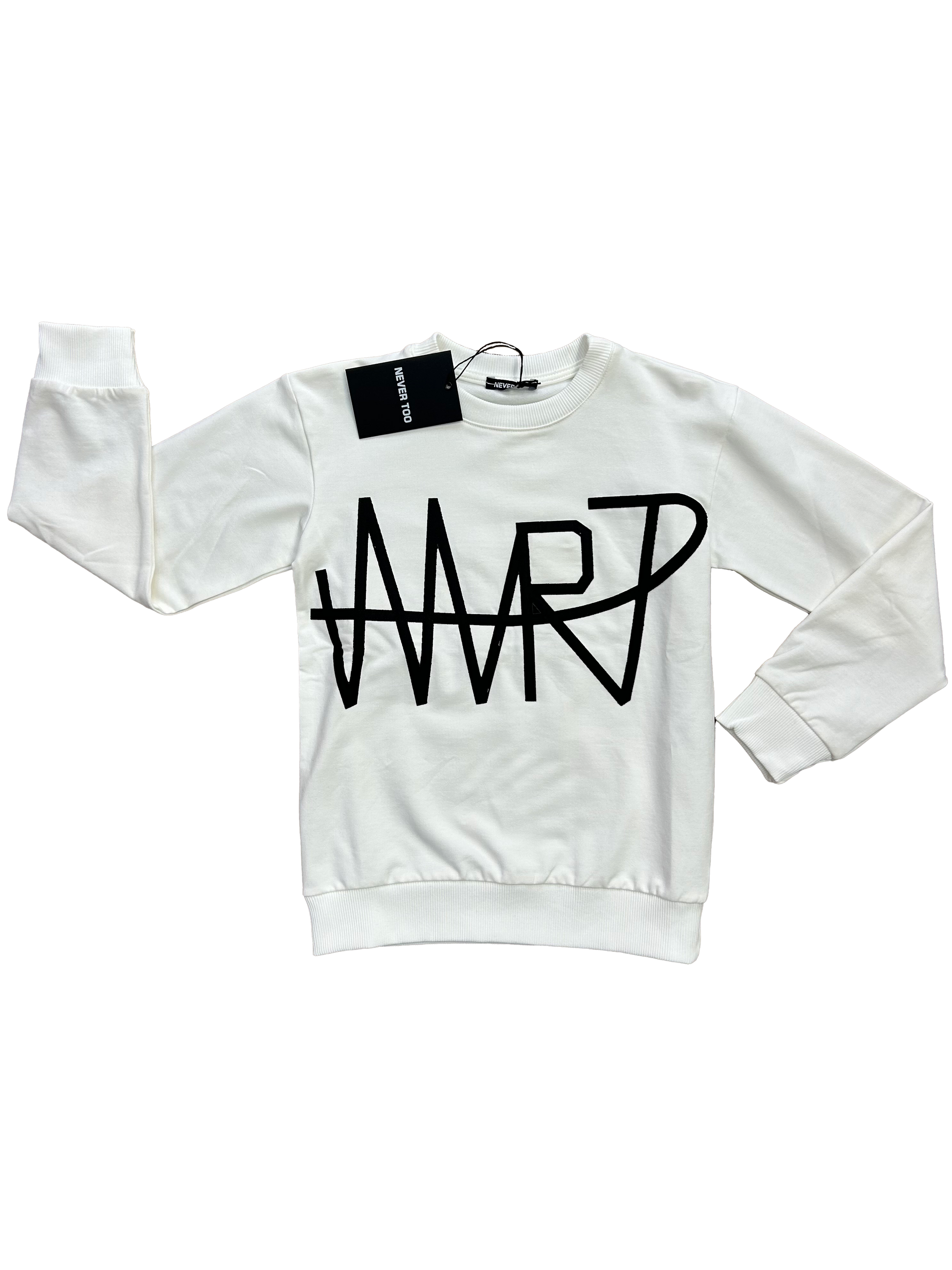 Felpa Never too girocollo bianca con toppe ricamate nere che richiamano in modo astratto le lettere del brand.