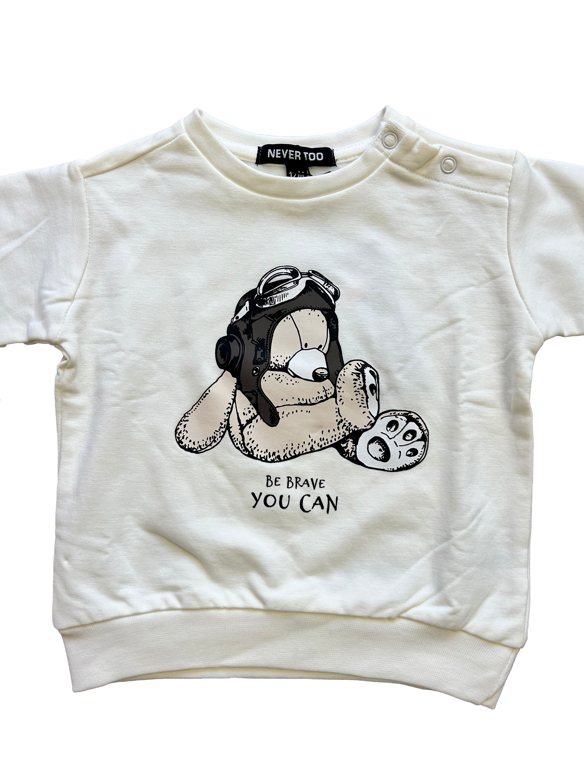 Felpina Never too panna con simpatica stampa dell’orsetto aviatore sul davanti. Leggermente felpata all’interno, è morbida, confortevole e perfetta per l’uso quotidiano dei più piccoli.