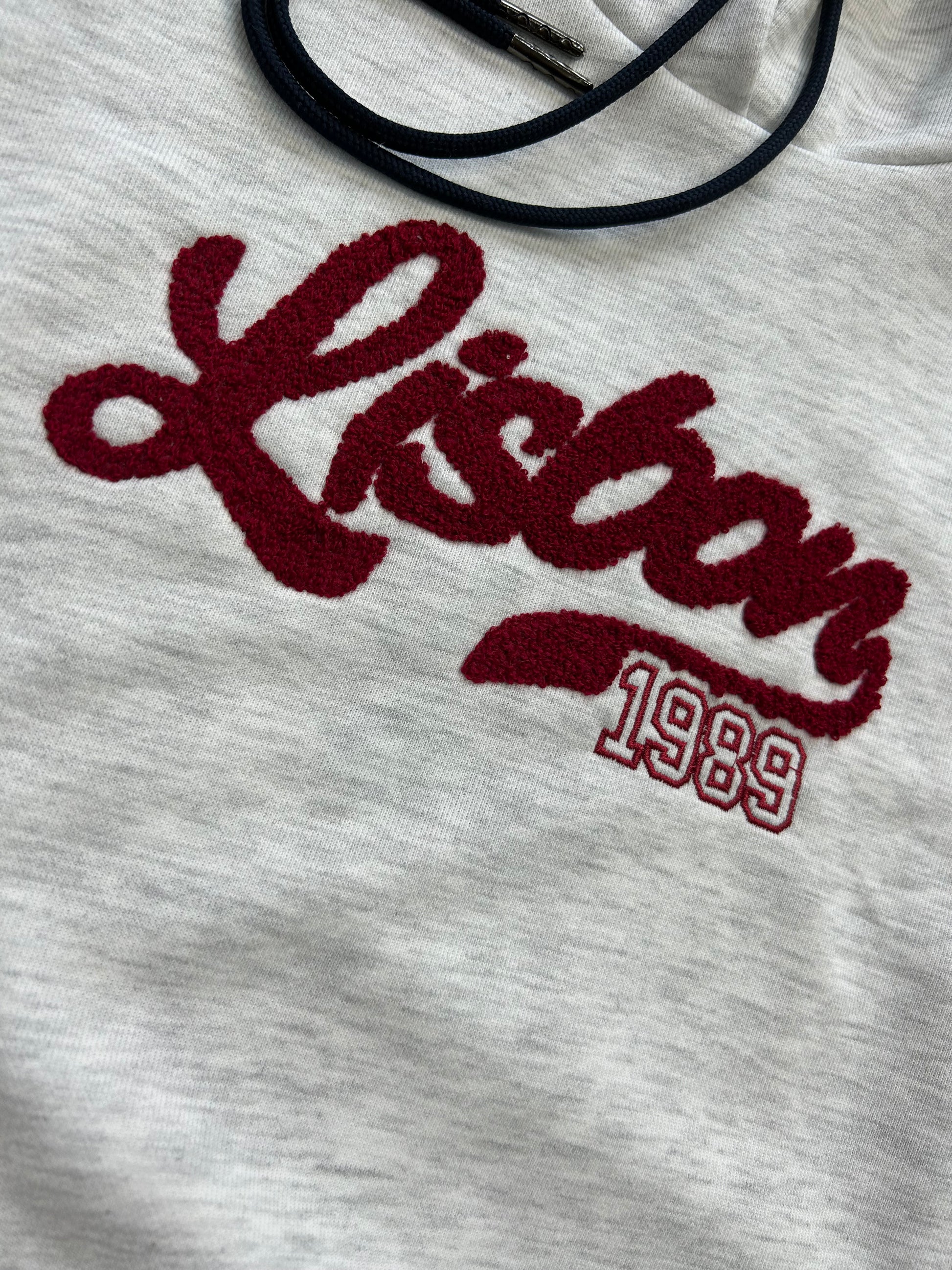 Felpa Never too con cappuccio grigio melange in cotone garzato, con stampa “Lisbon” a contrasto bordeaux e laccetti regolabili blu.