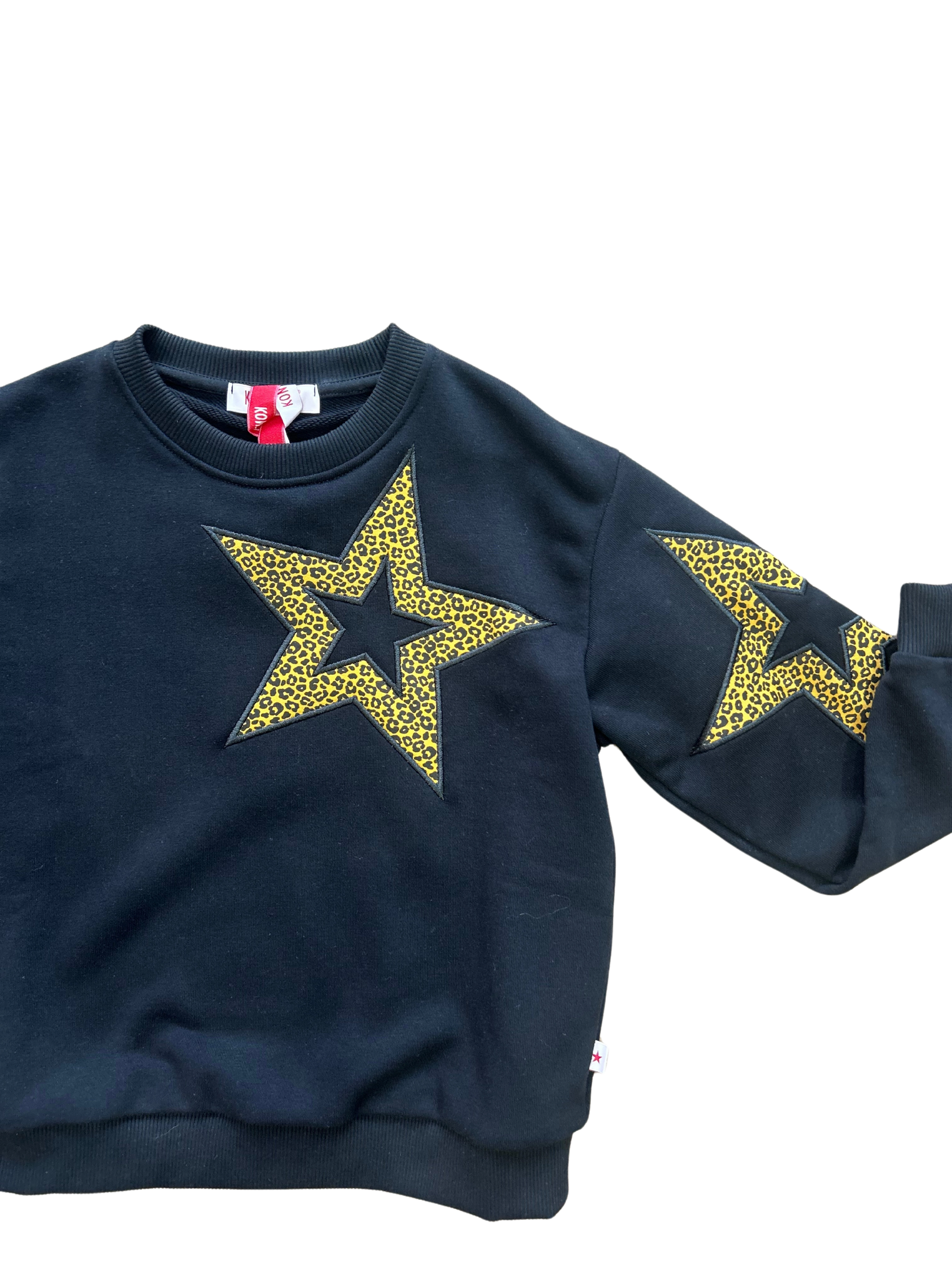 Felpa Kontatto nera in cotone con stella animalier sul davanti e sul braccio. Elastico sul fondo e sui polsini.