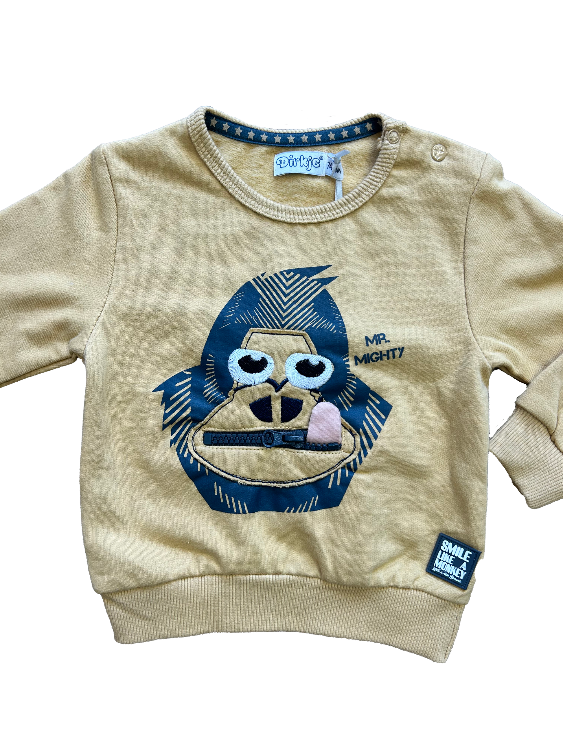 Felpa Dirkje girocollo felpata in giallo senape tenue, con simpatica stampa frontale di una scimmietta con linguaccia e dettaglio zip sulle labbra.