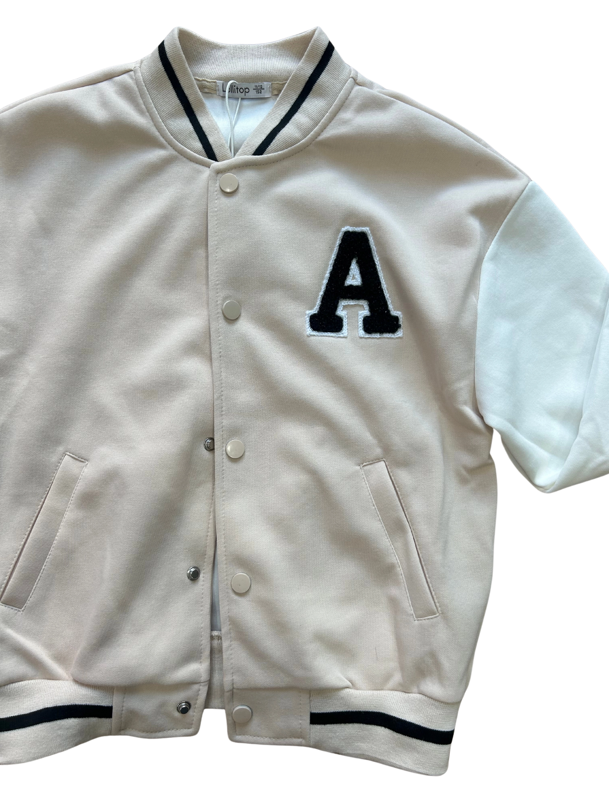 College Lollitop in cotone per bambina. Davanti beige, maniche in bianco, dettagli neri. Bottone a pressione. Polsino sul fondo e sulle maniche,"A" glitterata.