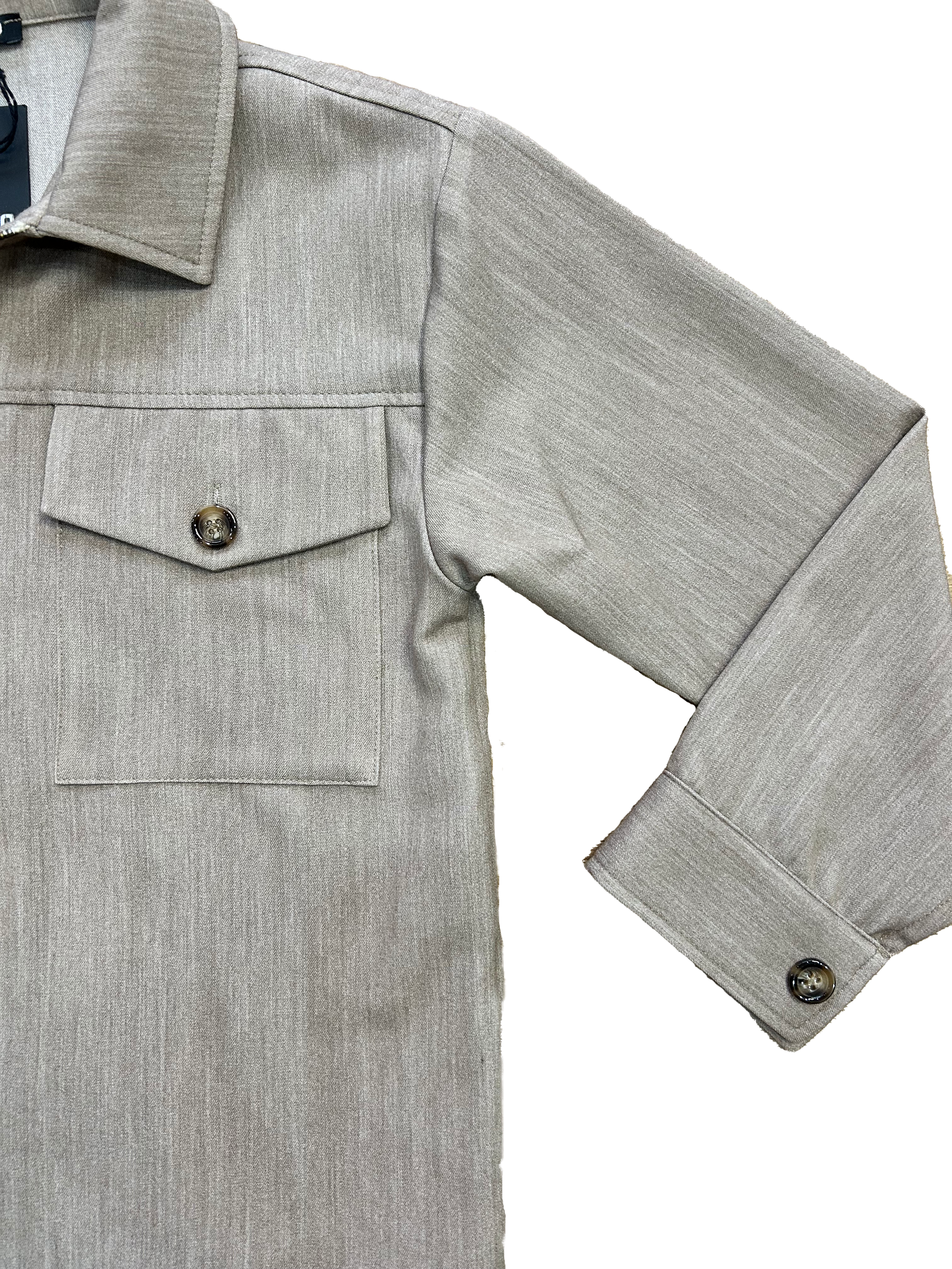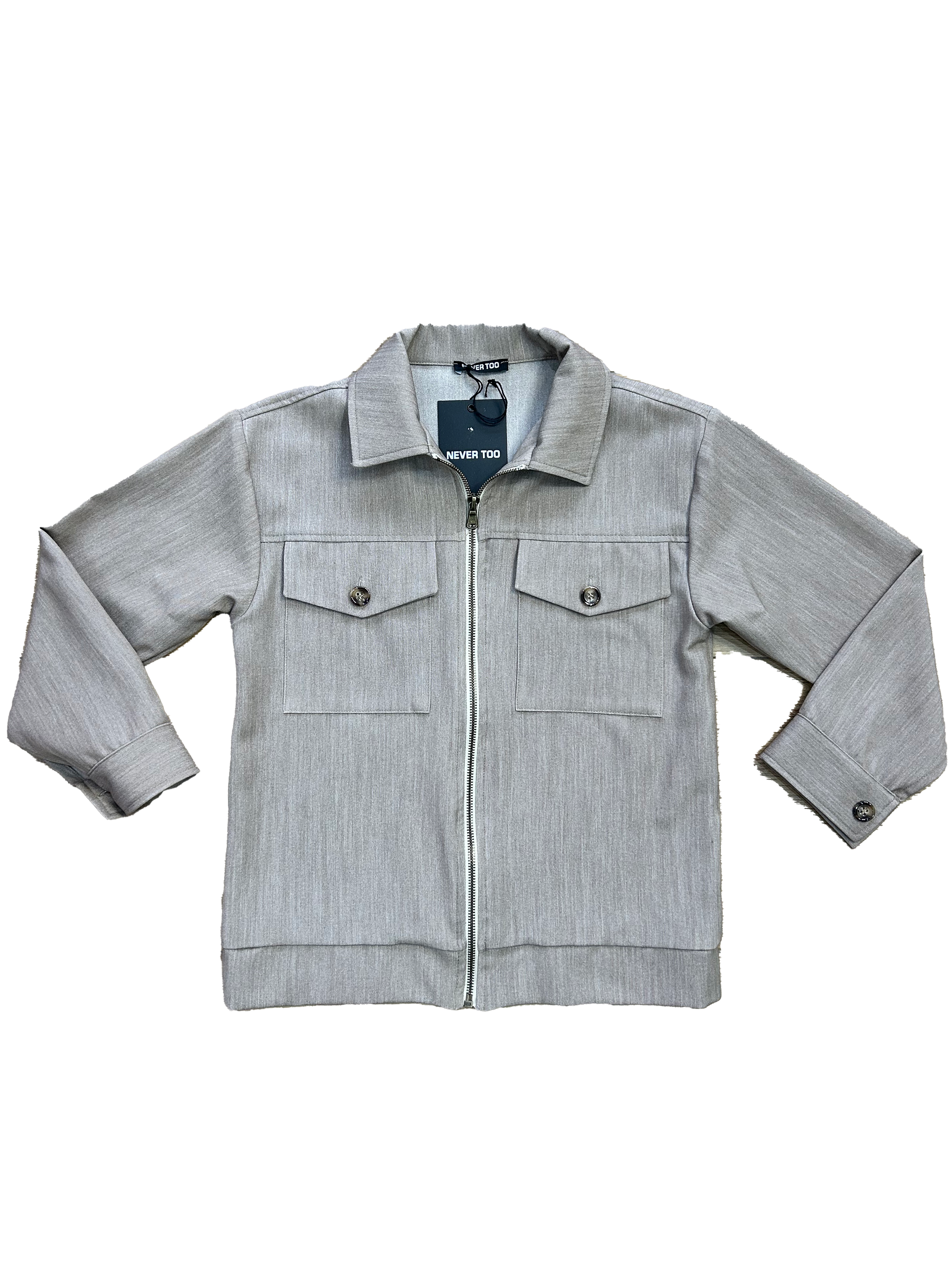 Giacca Never too in tessuto beige con chiusura a zip frontale, colletto classico e tasche con pattina e bottone sul petto.