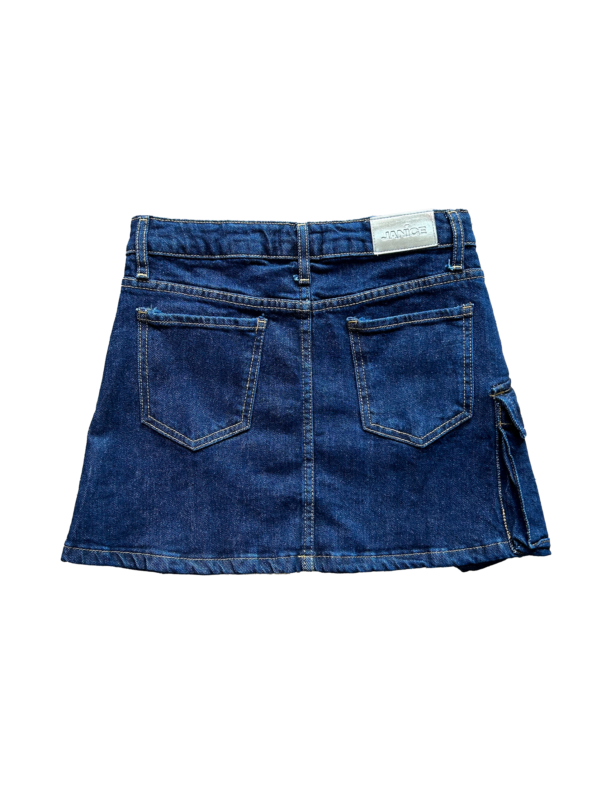 Gonna Janice in denim blu con tascone laterale e cuciture marroni.Dotata di bottone interno ed elastico regolabile con asole per una vestibilità perfetta.