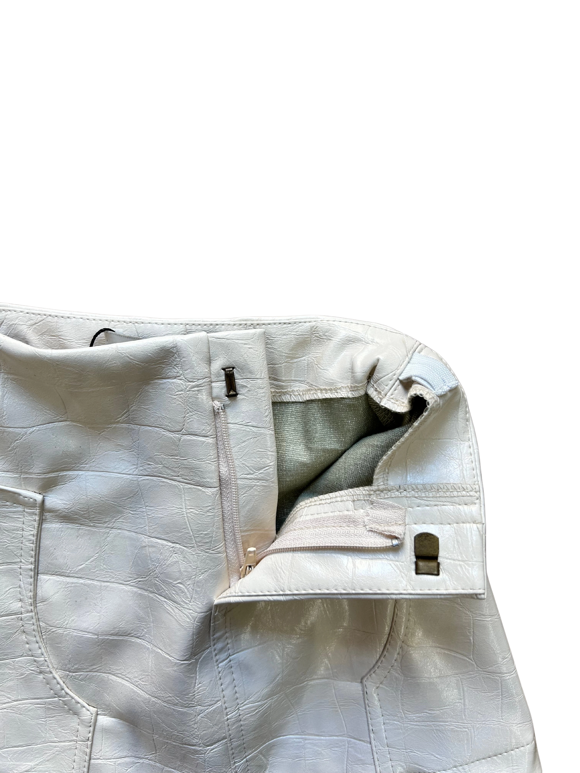 Minigonna Alice beige chiaro in ecopelle effetto pitonato colore su colore. Cerniera sul davanti, all'interno elastico con asole per stringerla all'occorrenza.