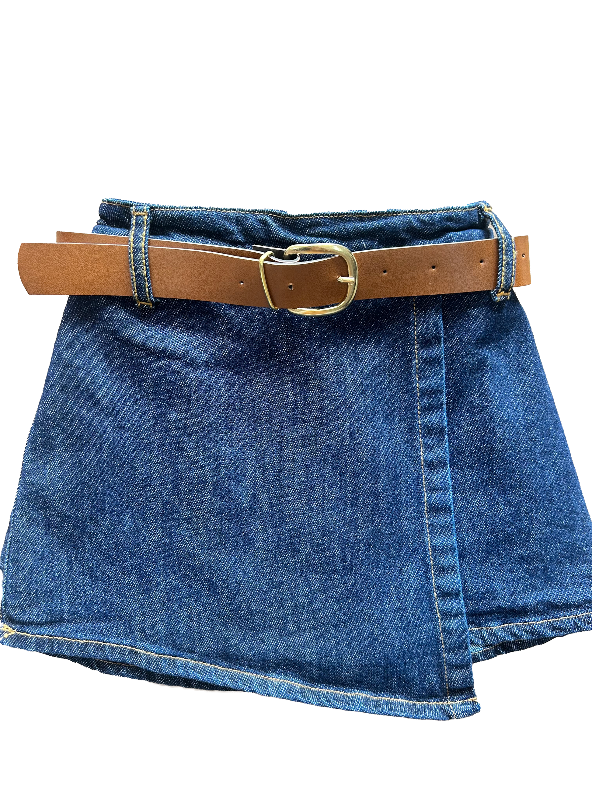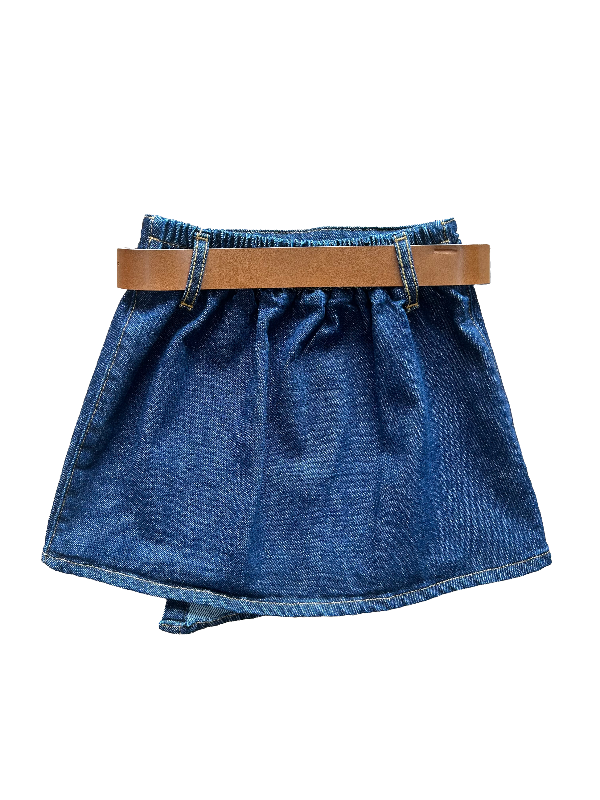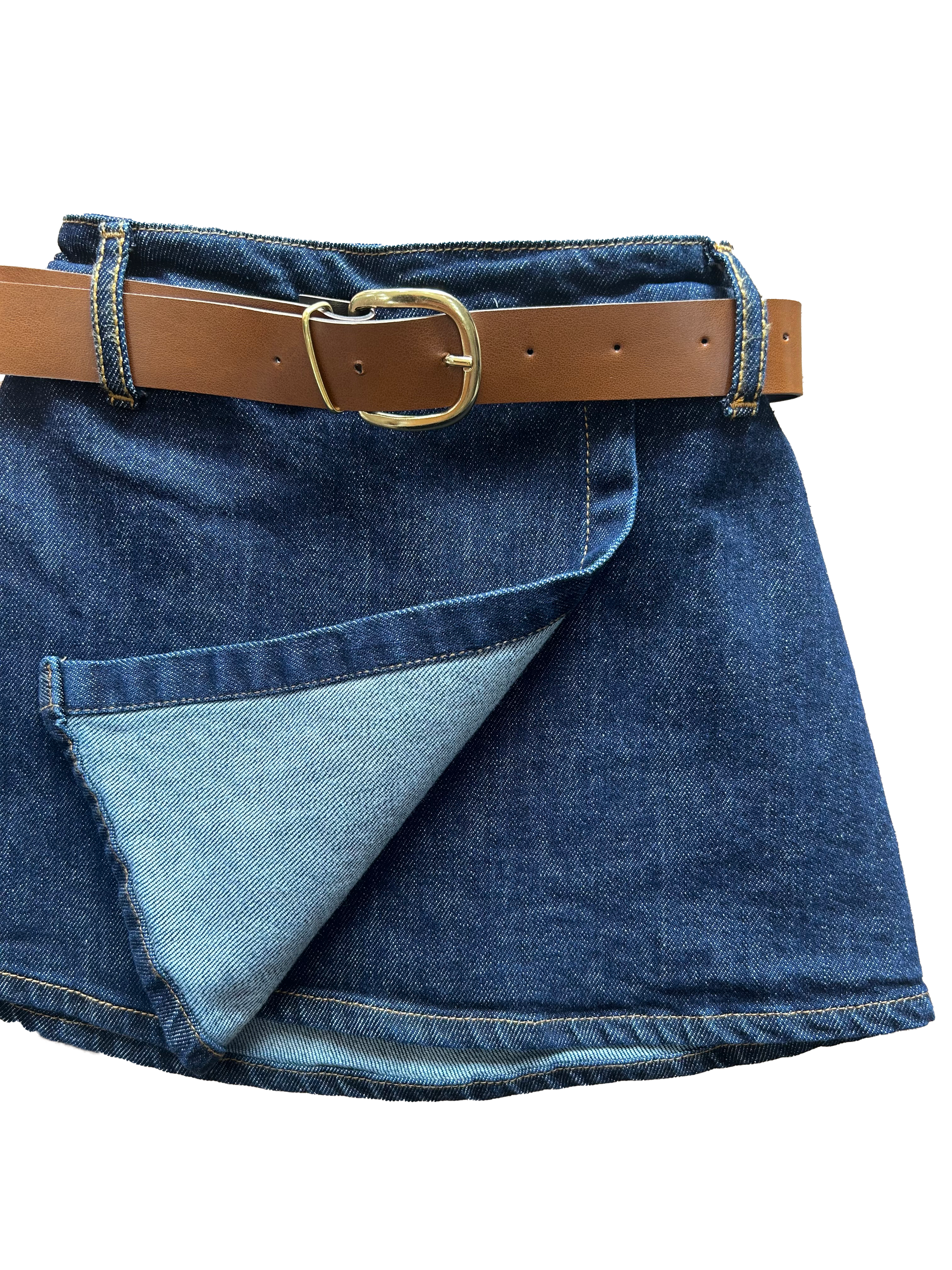 Gonna Janice in denim scuro con elastico sul retro e cintura in ecopelle biscotto.
