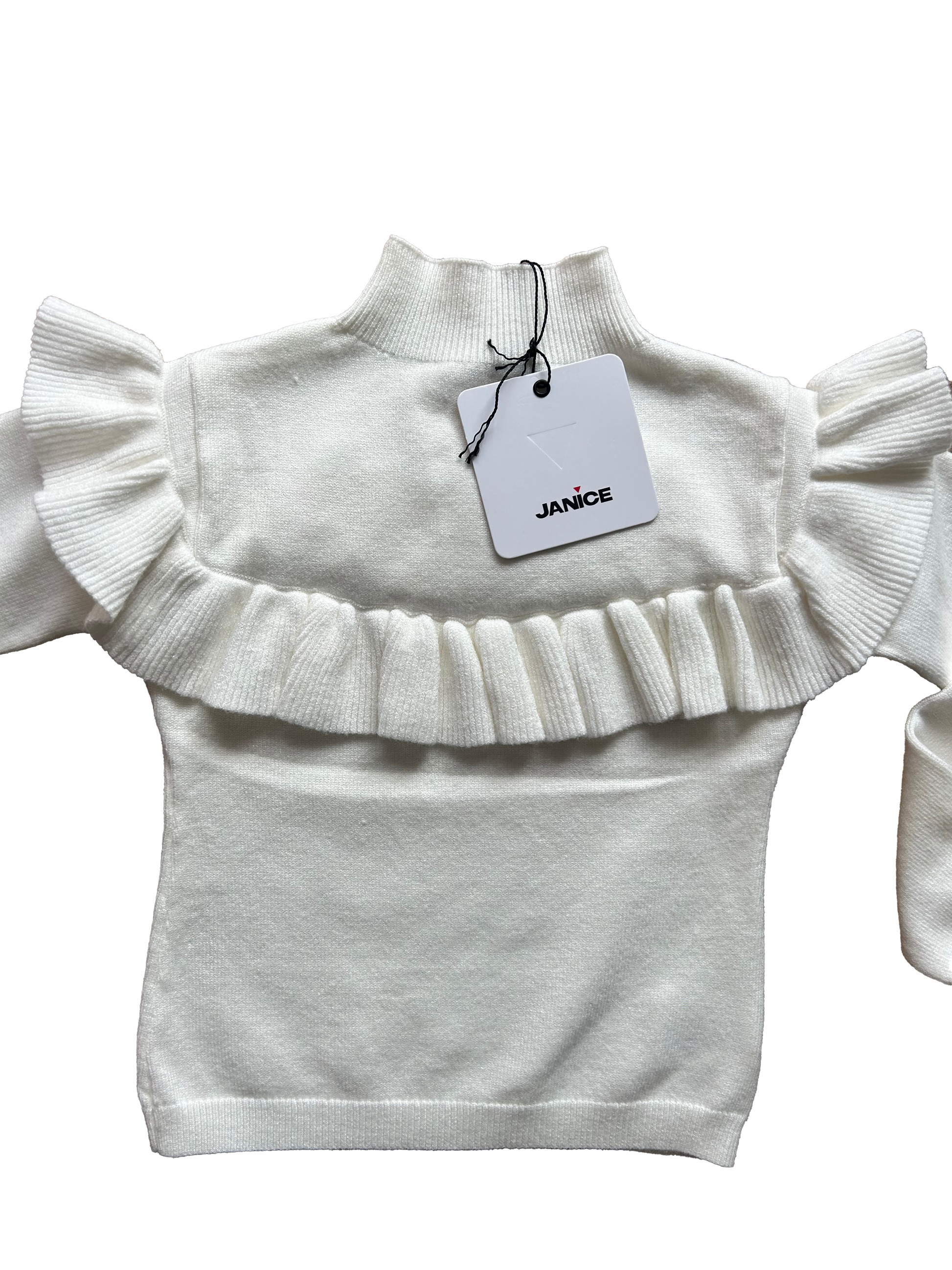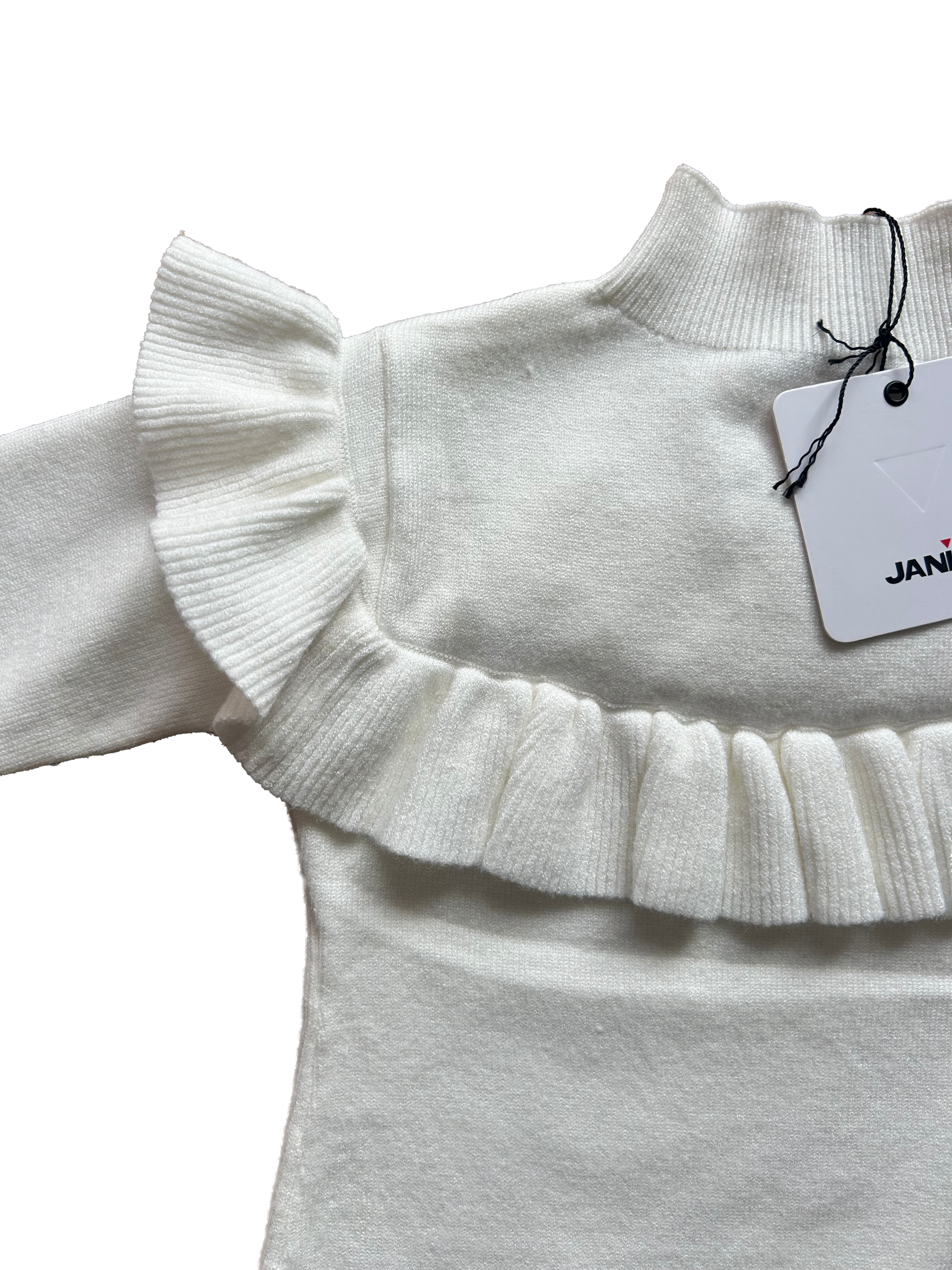 Maglioncino Janice bianco a mezza collo, super morbido, con delicate ruches sul davanti e sulle spalle.