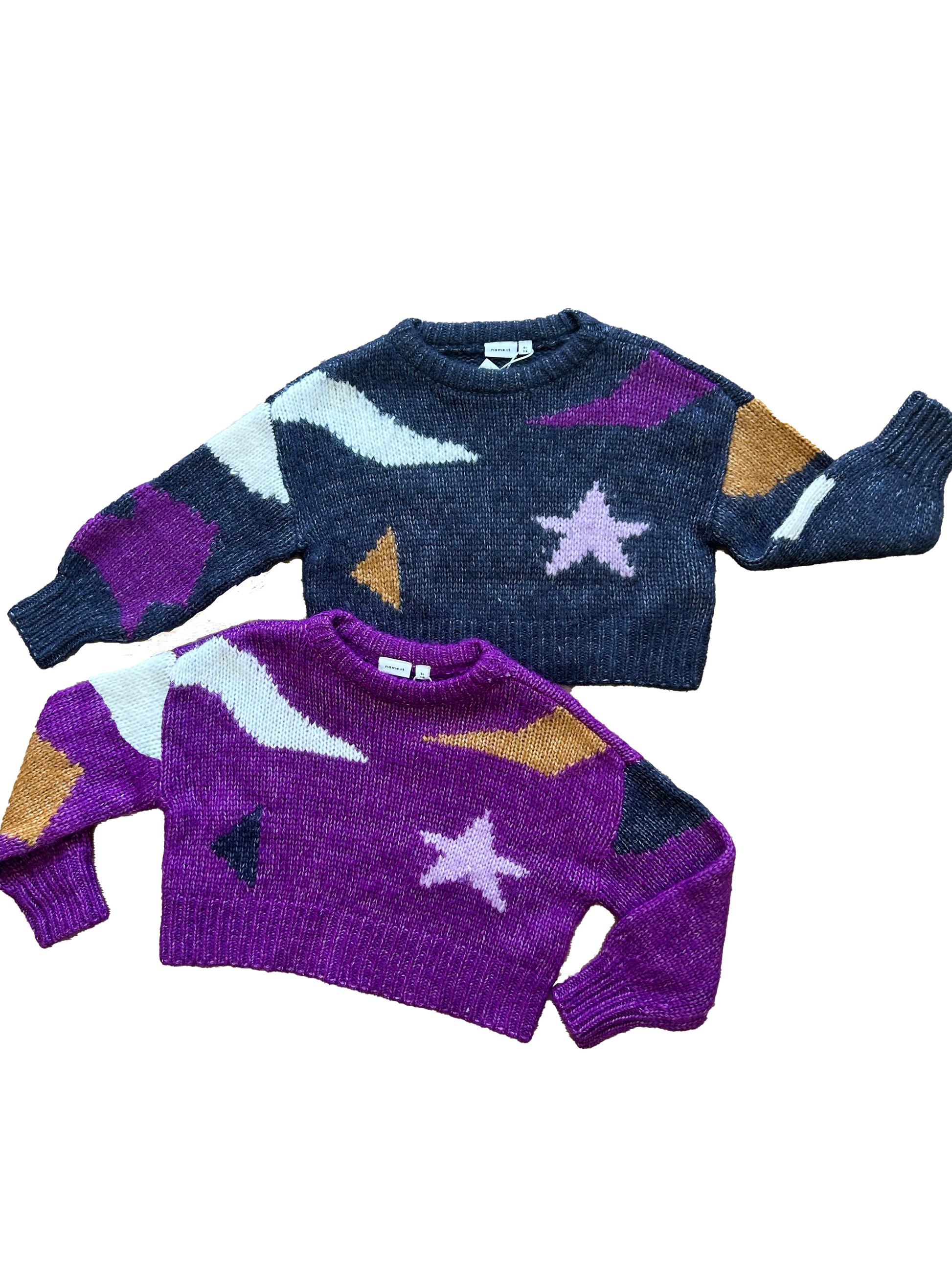 Maglioncino Name it leggermente crop e dalla vestibilità morbida, impreziosito da fantasie astratte e stelle colorate.