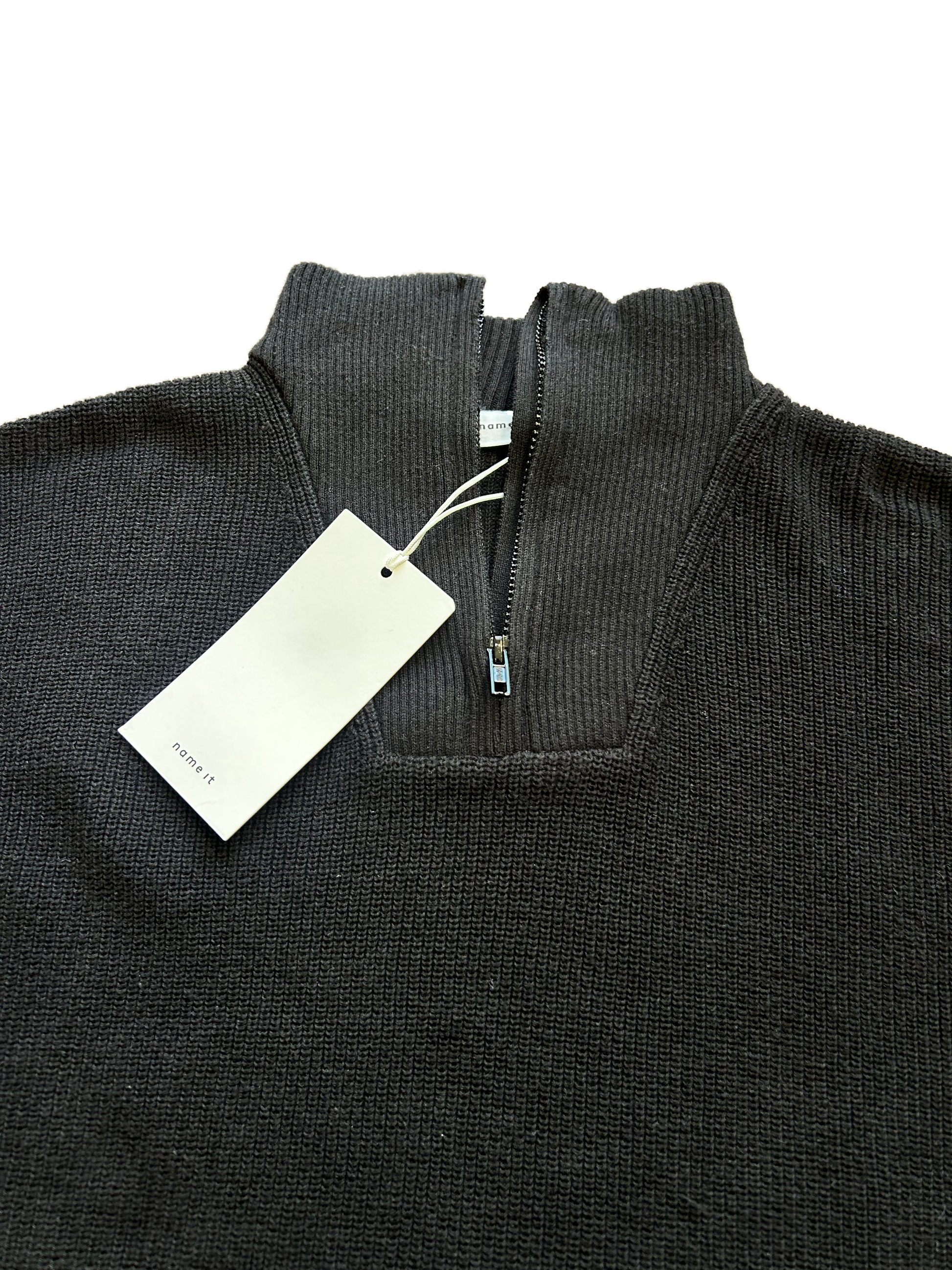 Maglioncino Name it nero lavorato a treccia sottile che crea un elegante effetto a costina. Il collo con mezza zip dona un tocco sportivo e versatile, perfetto da abbinare a un jeans per un look casual o a un pantalone più elegante per un’occasione speciale.