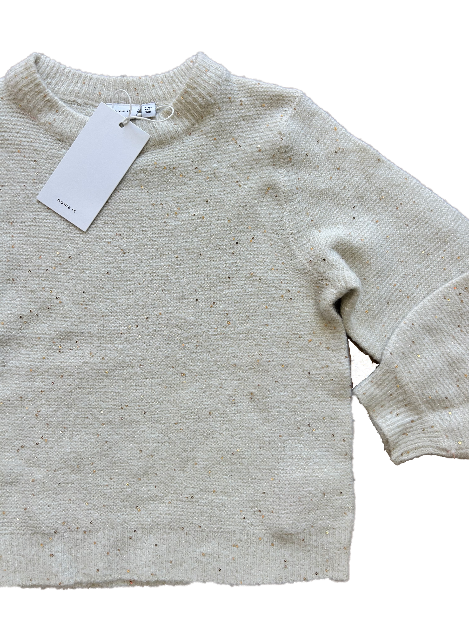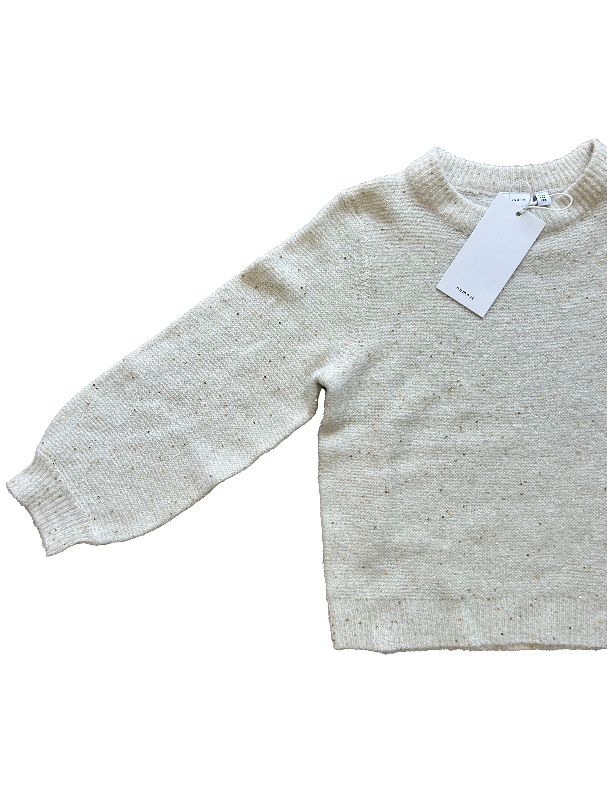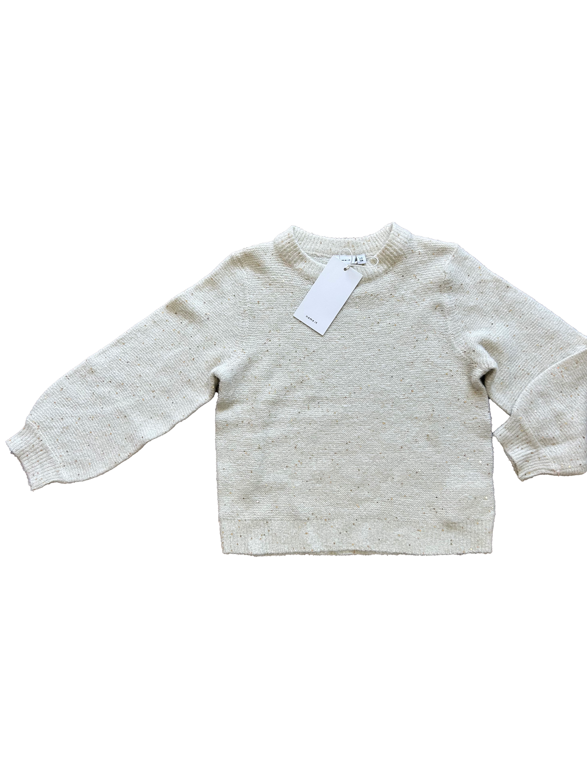 Maglioncino Name it girocollo panna con piccole paillettes oro e manica a sbuffo.