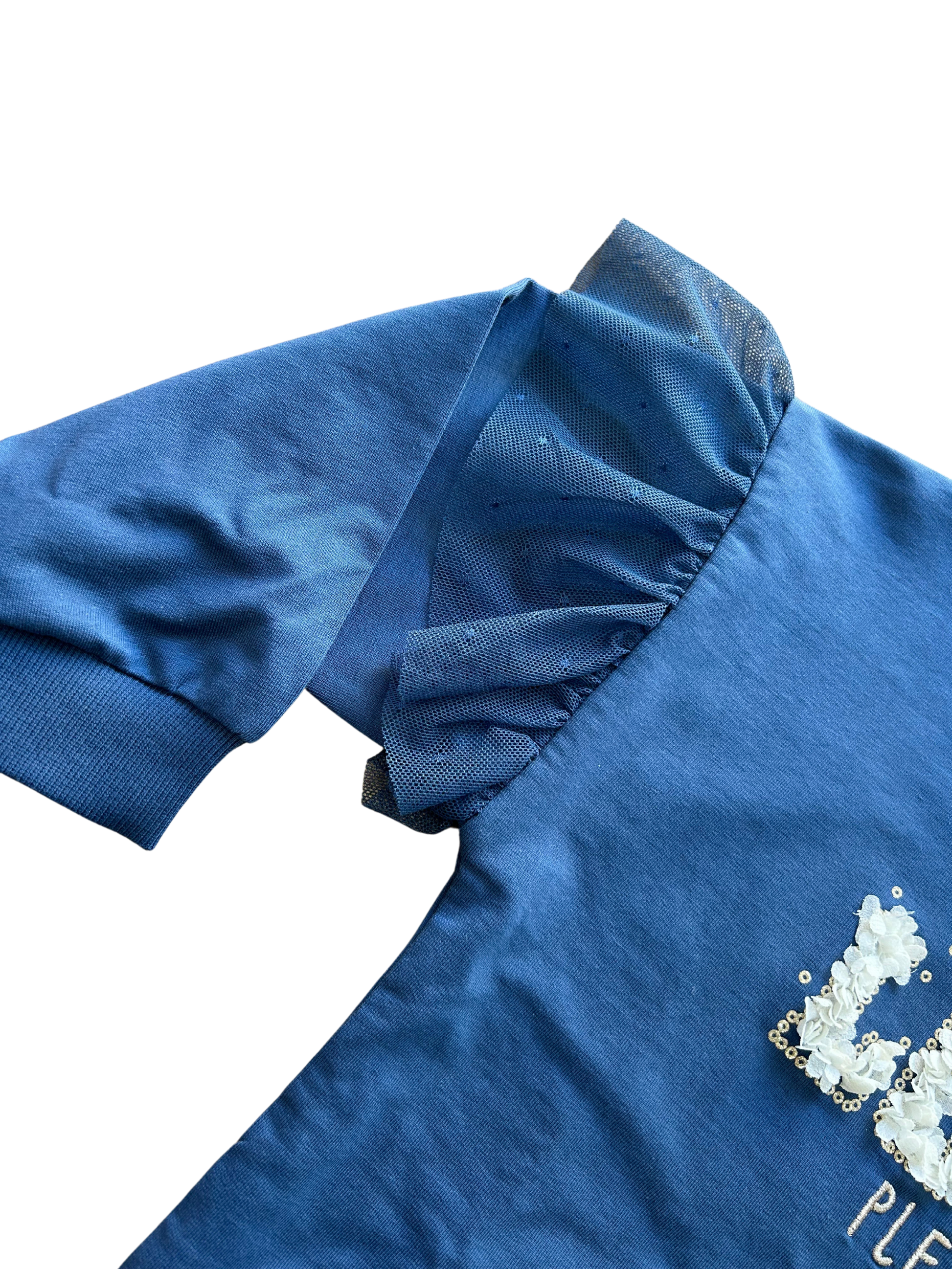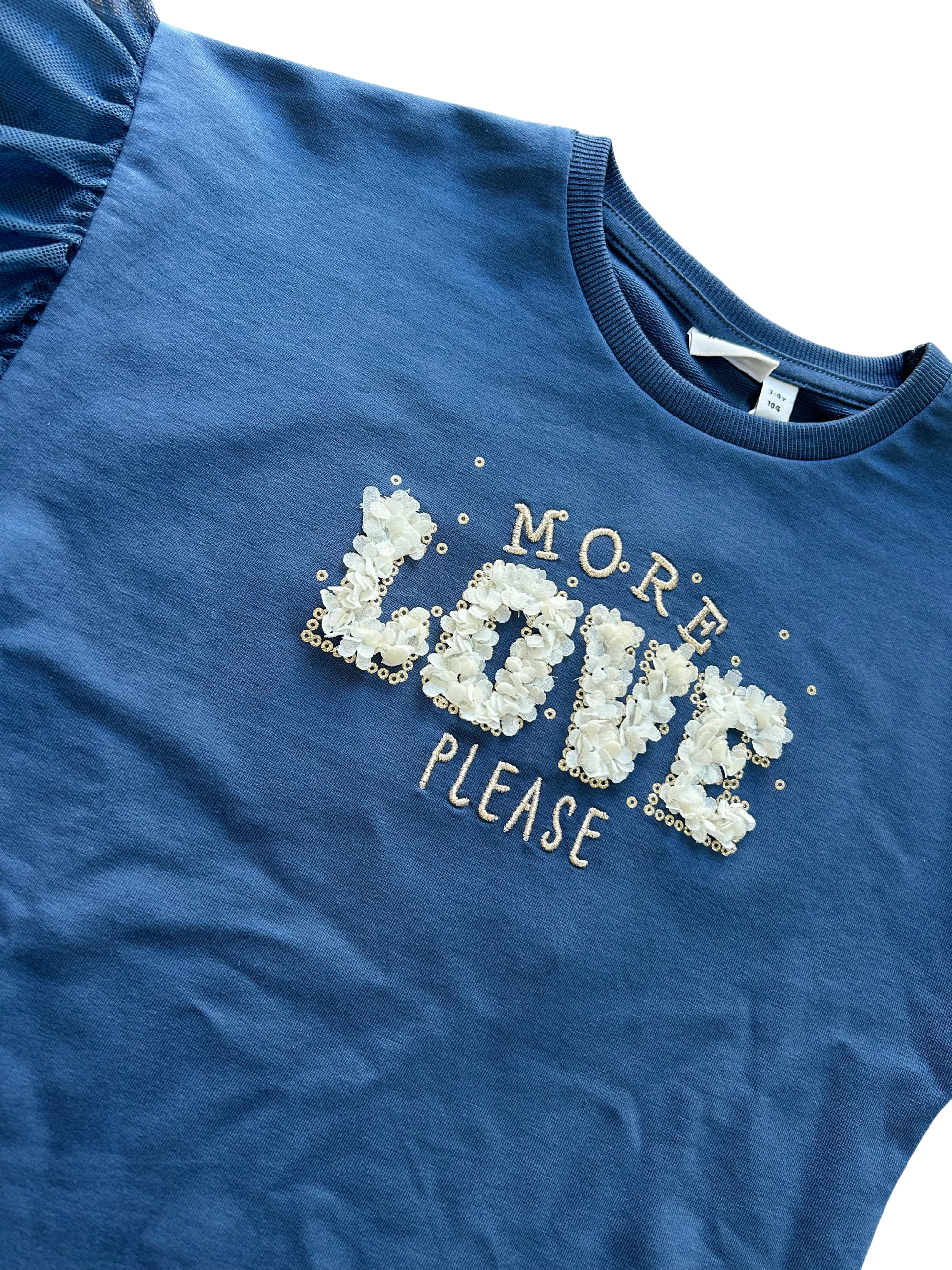 Maxi felpina Name-it in cotone garzato con ricamo oro, applicazione petali e tulle a pois sulle maniche.