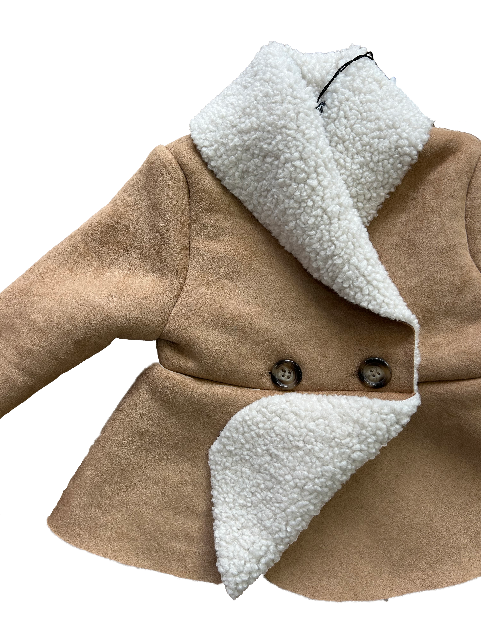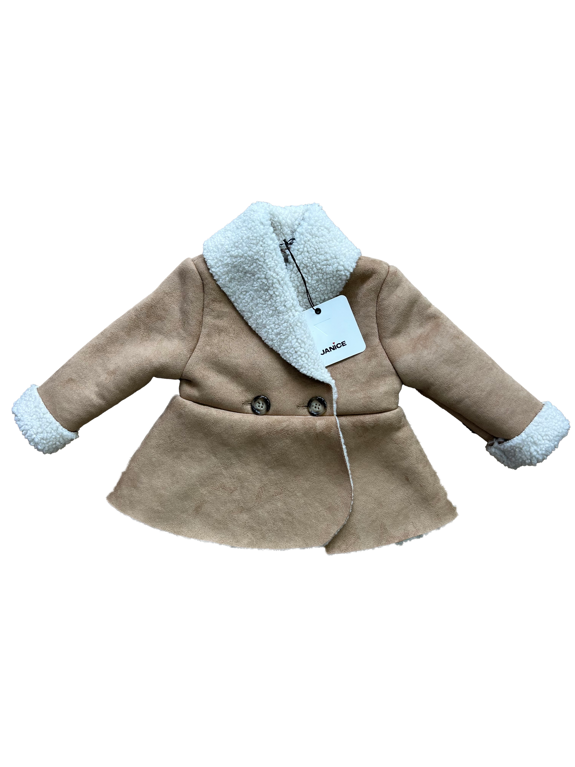 Montoncino Janice a cappottino in tessuto scamosciato beige, con interno in morbido teddy panna. Modello doppiopetto con due bottoni effetto legno, cucitura in vita e fondo leggermente svasato.