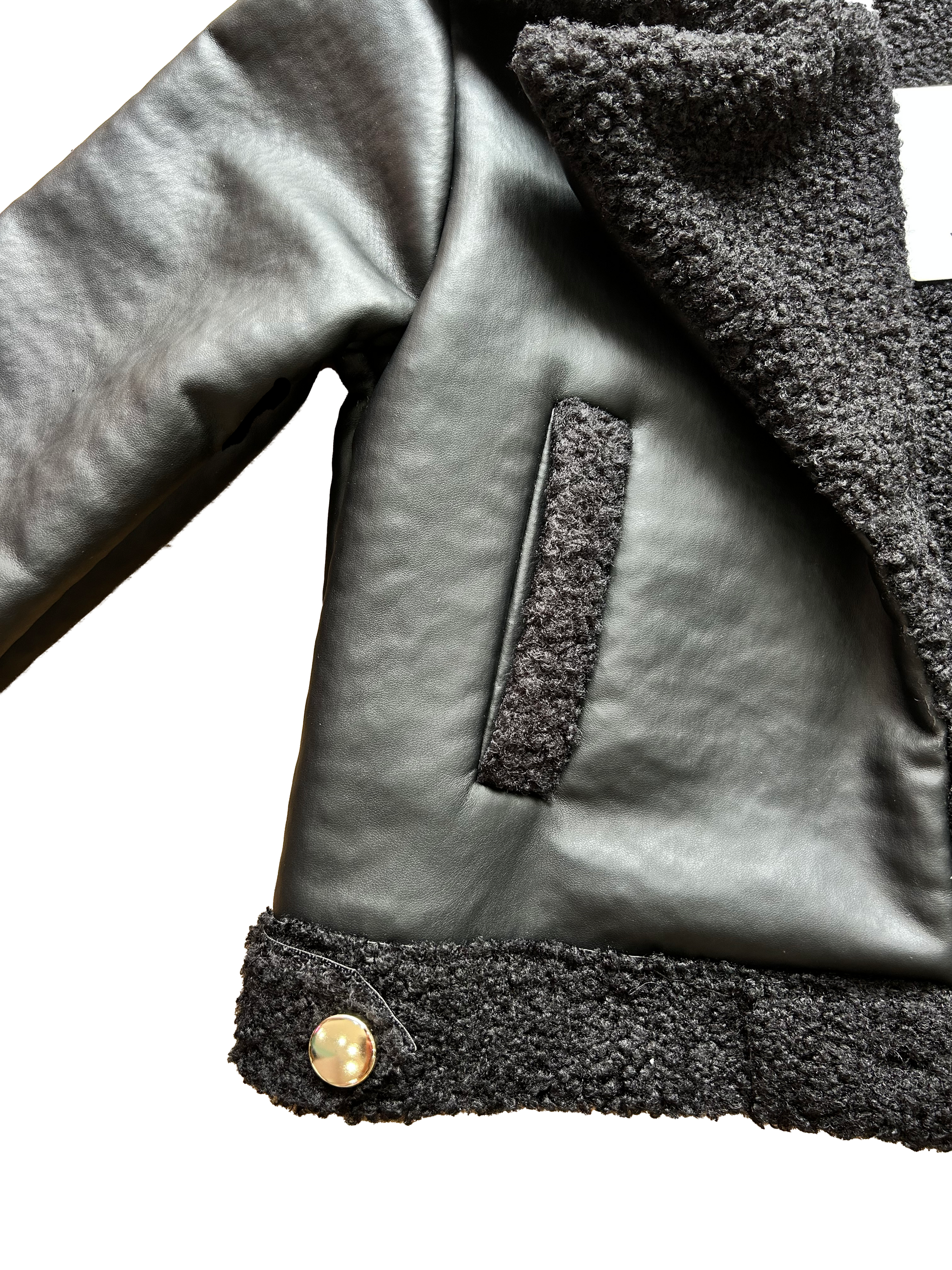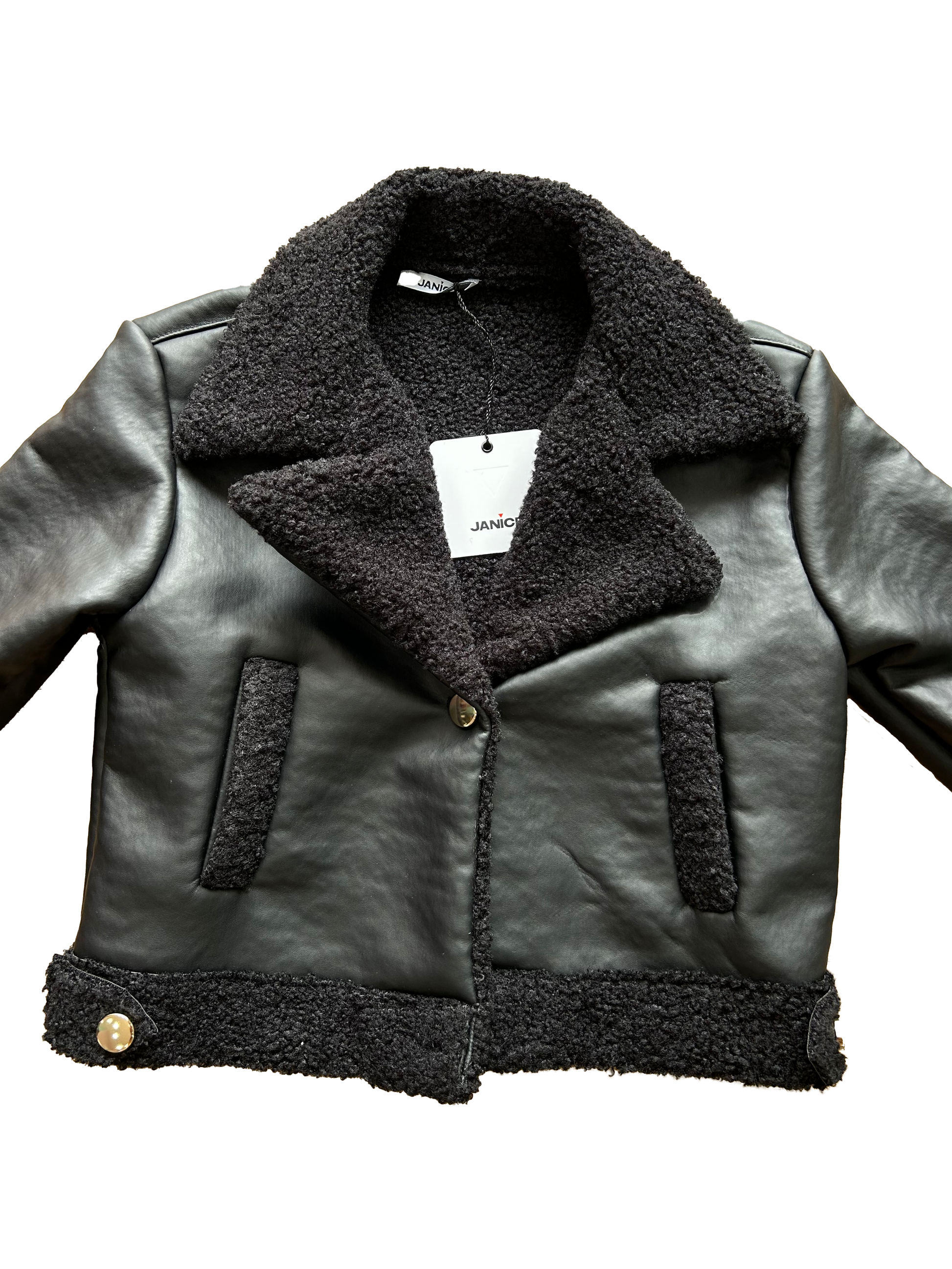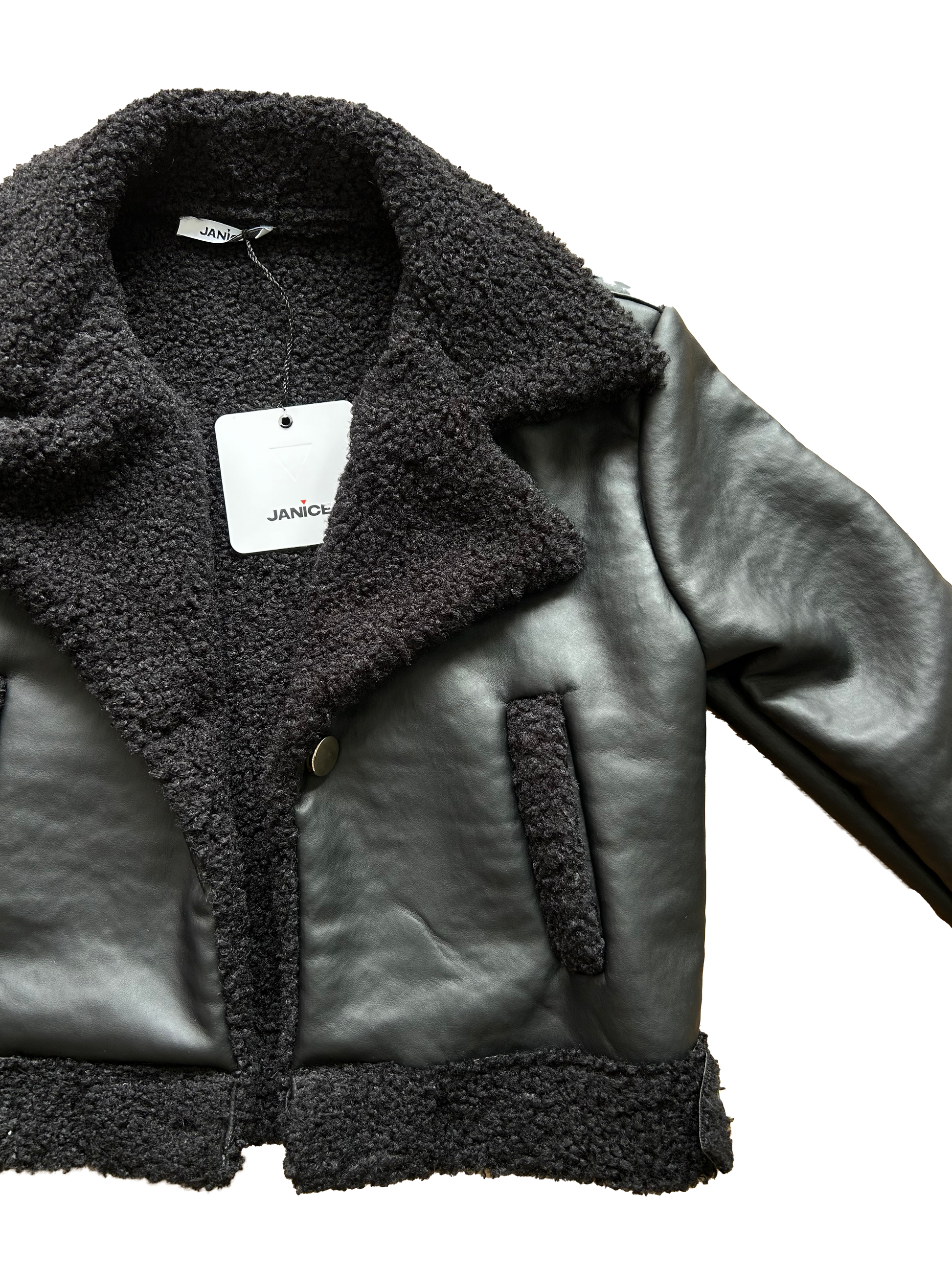 Il Montone in ecopelle firmato Janice è un capo must-have per un look deciso ma raffinato. Impreziosito da rever in stile giacca, risvolti delle maniche e bordi in morbido teddy. I bottoni oro illuminano il design, rendendolo ancora più ricercato.