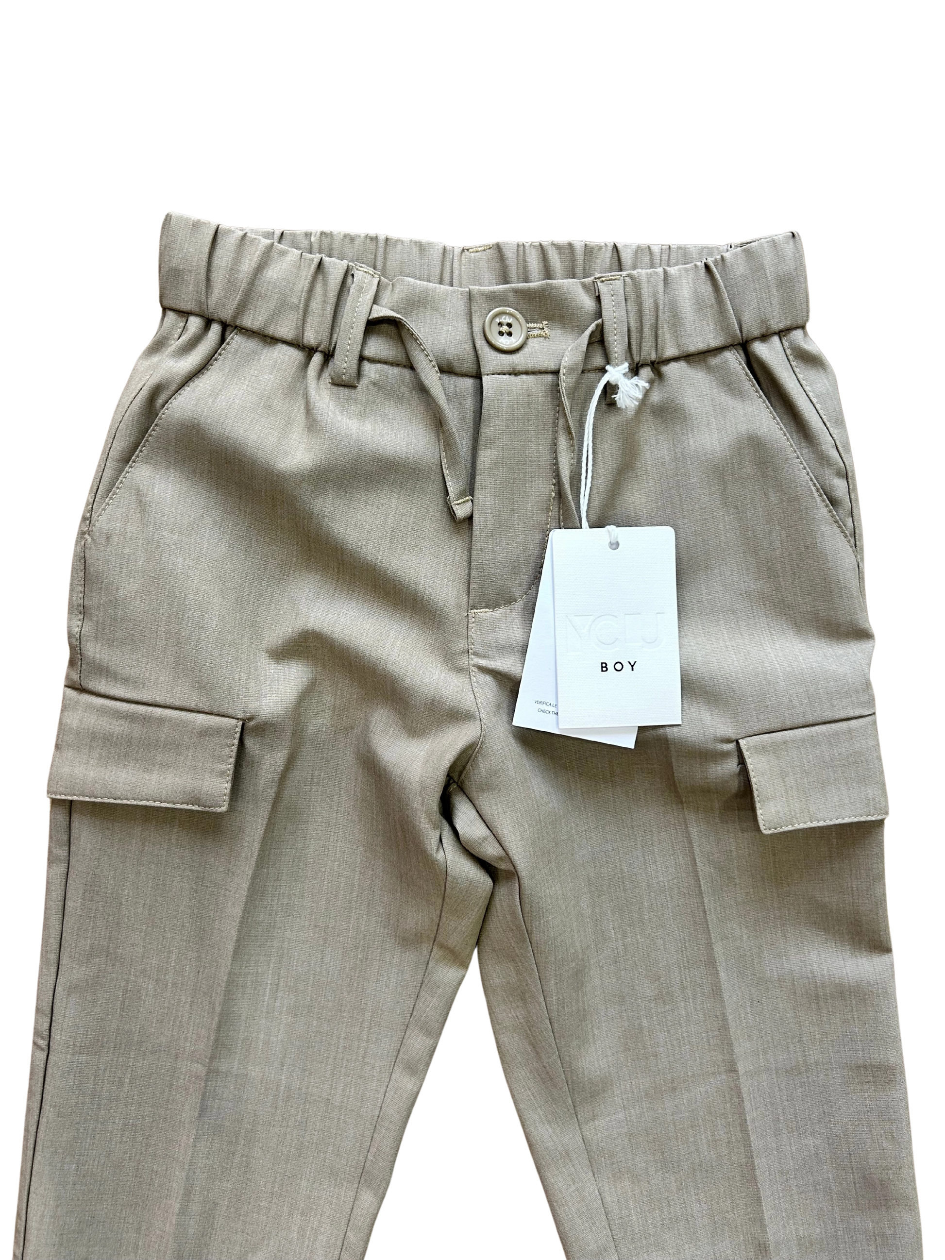 Pantalaccio Yclu beige con elastico e laccetto in vita, finti tasconi laterali e tasca a filo.