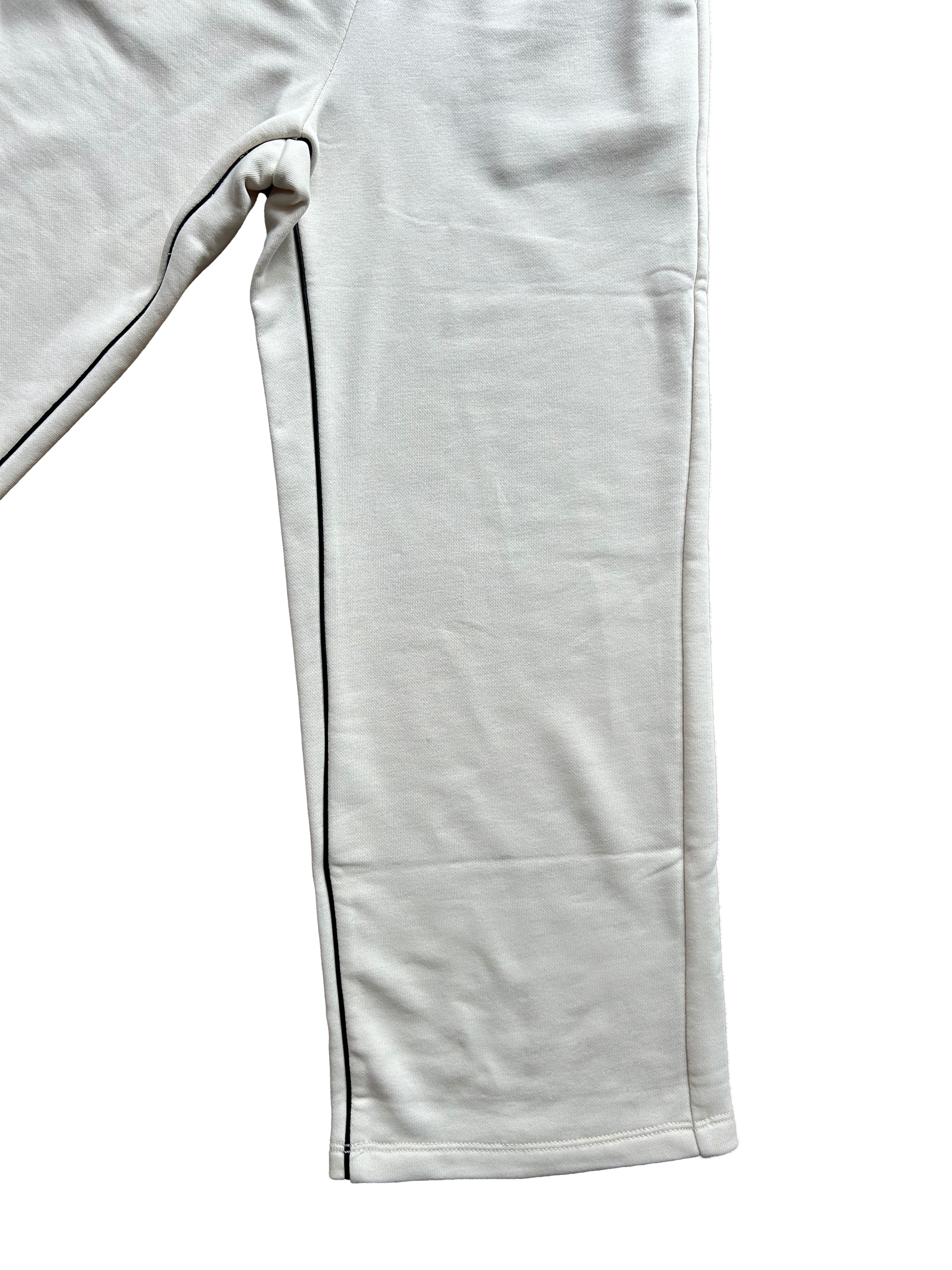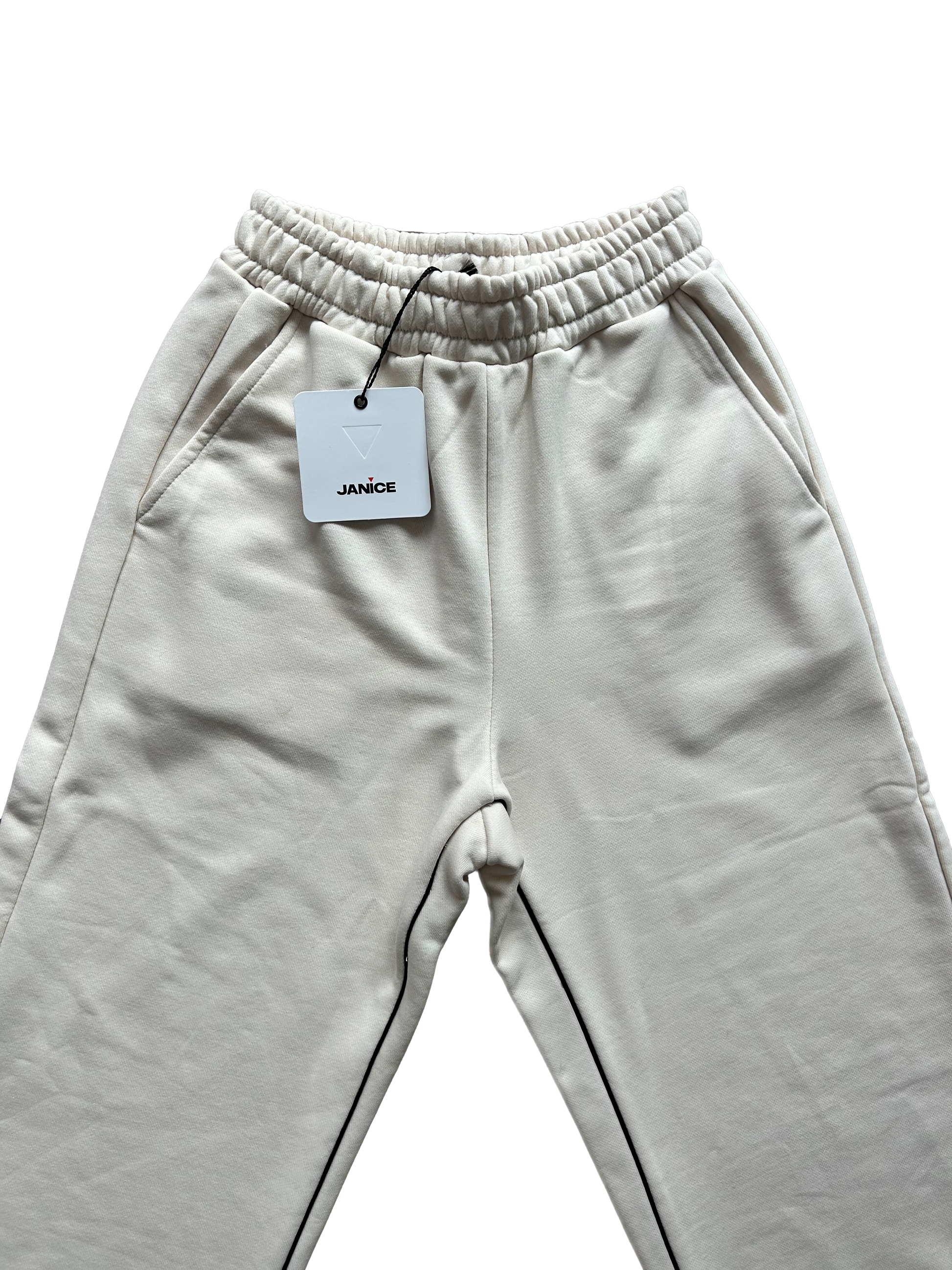 Pantalone Janice a palazzo con elastico in vita per massimo comfort, arricchito da un sottile bordino nero che richiama il fiore della felpa.