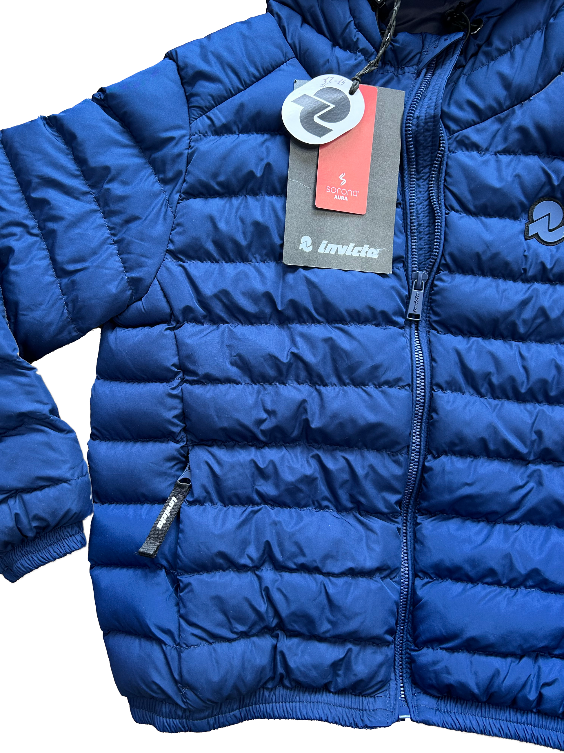 Piumino Invicta blu, realizzato con tessuto esterno idrorepellente e imbottitura calda ma leggera. Dotato delle iconiche cinghie interne che permettono di indossarlo come uno zainetto quando non serve, è morbido, comodo e non limita i movimenti.