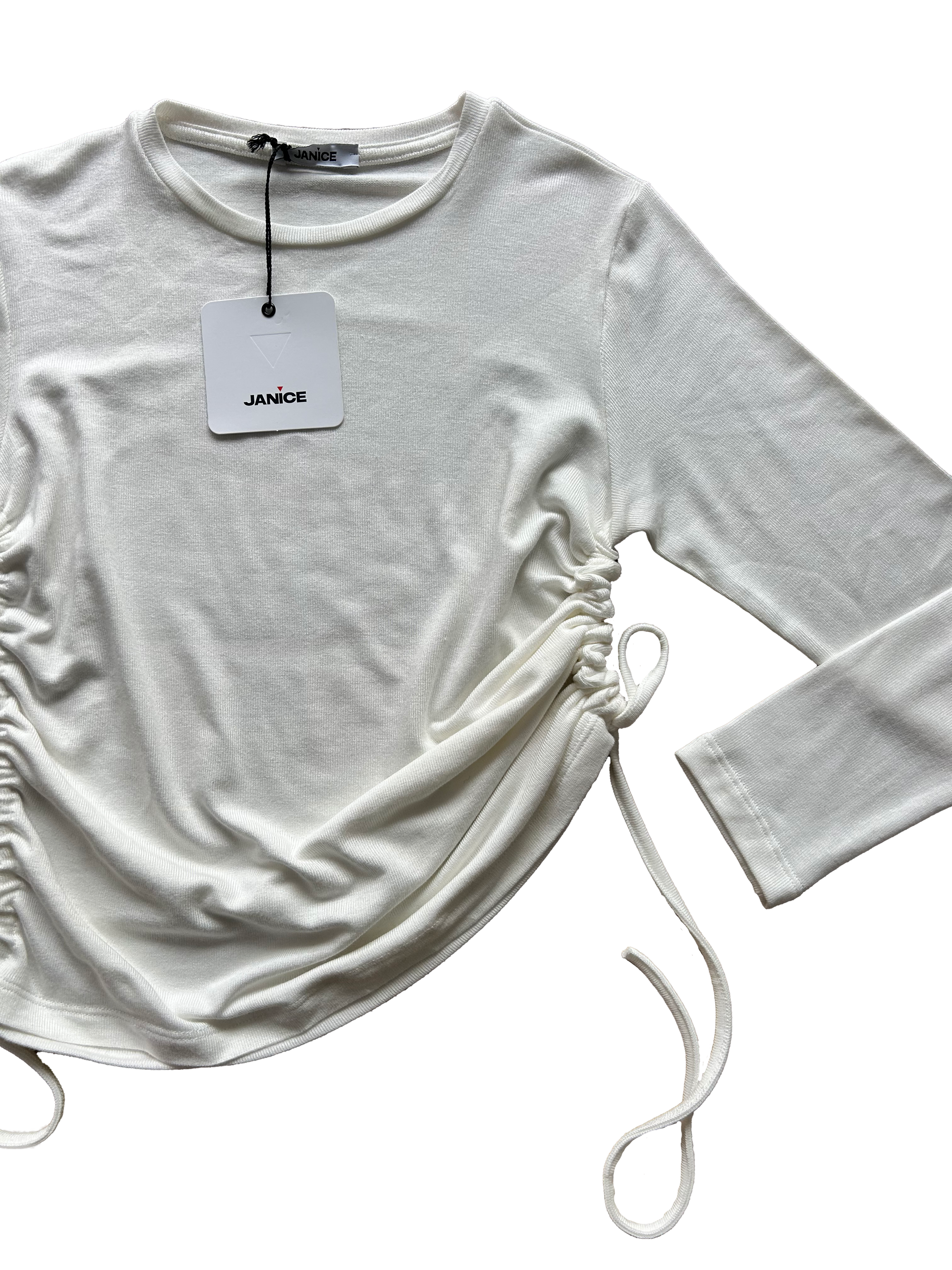 Shirt Janice a manica lunga in maglia girocollo, arricchita da elastici e laccetti regolabili sui lati.