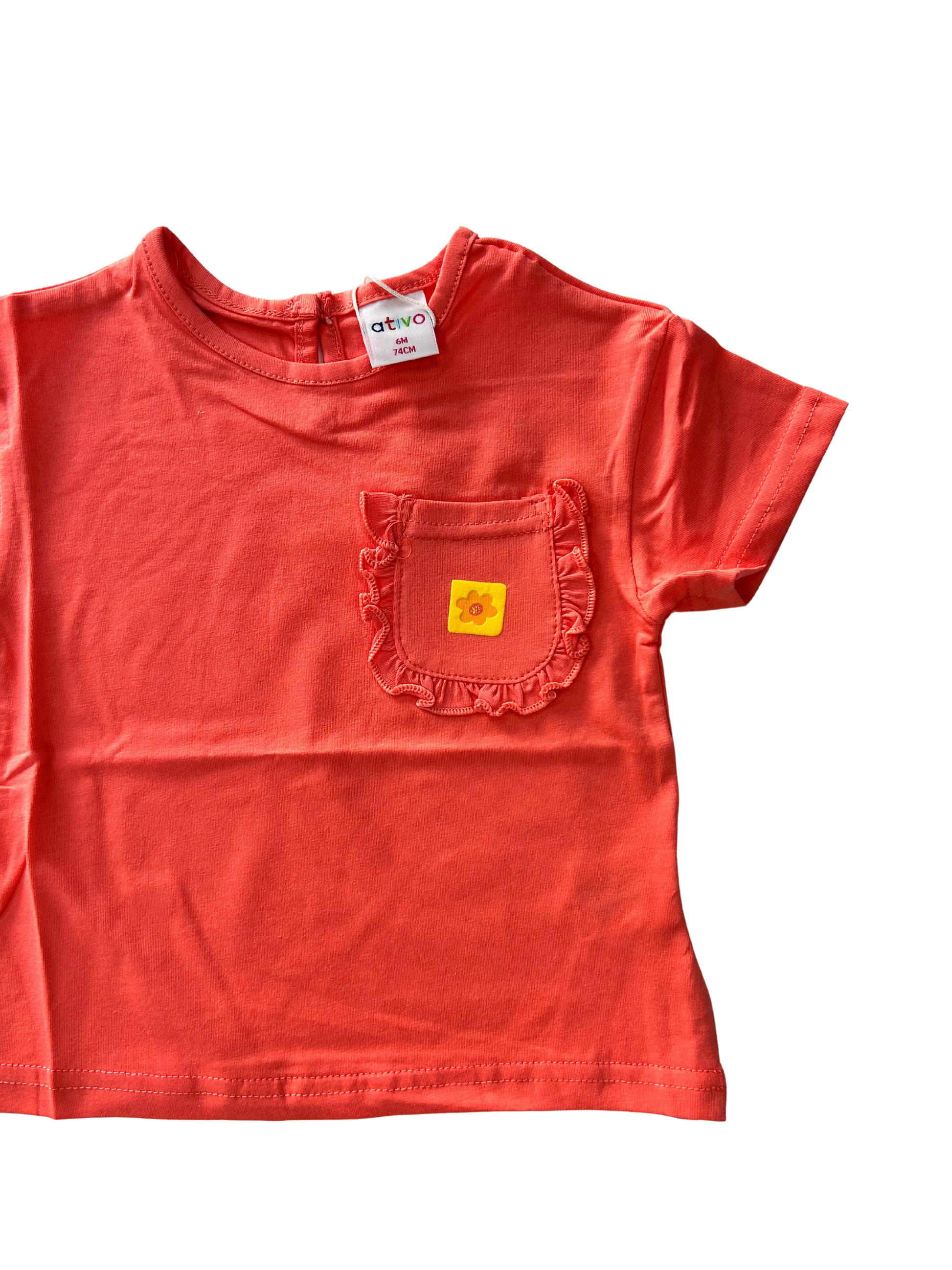 T-shirt Ativo con taschino con rouches, fiorellino centrale e bottoncino sul retro.