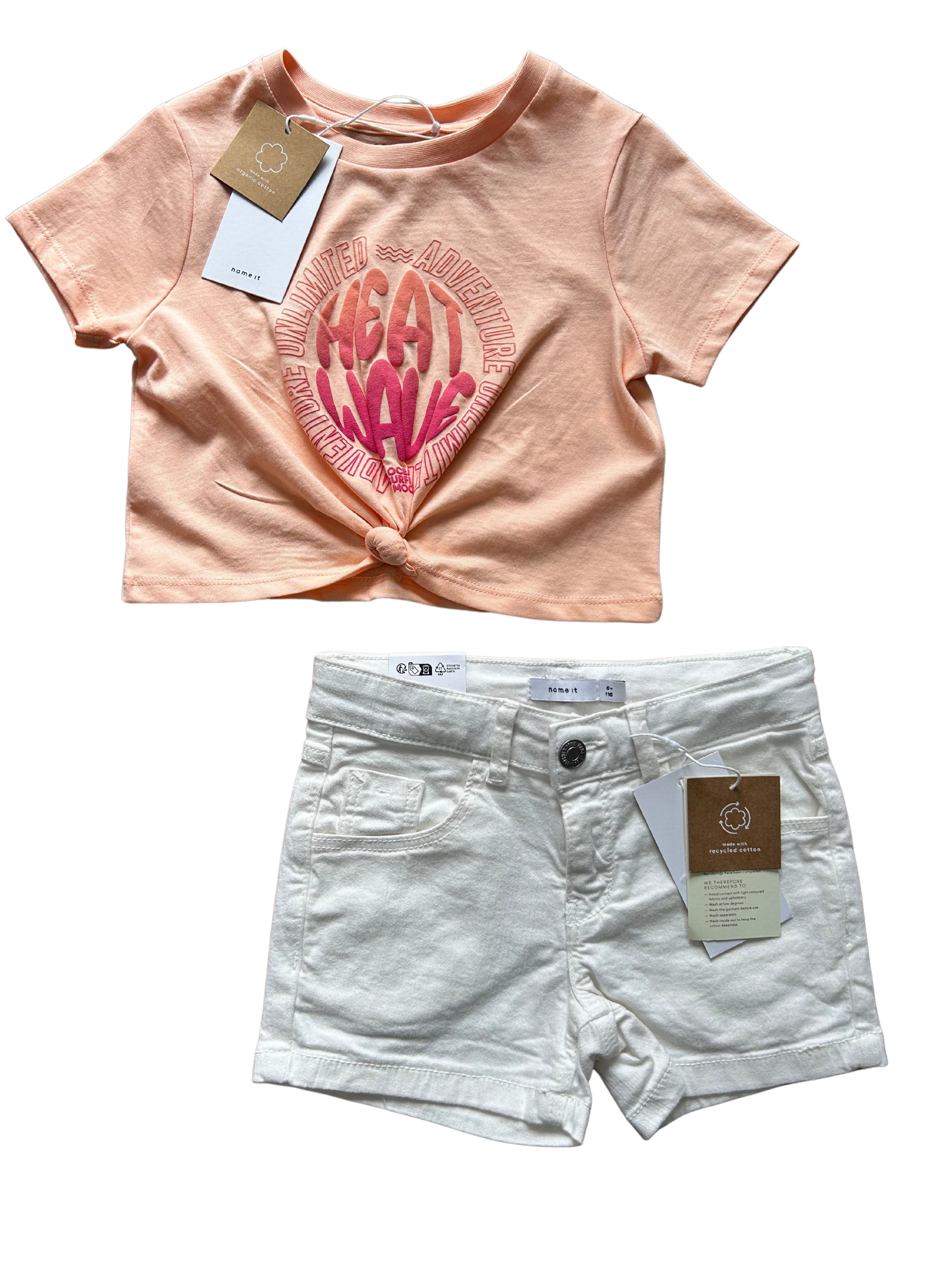T-shirt Name-it in due colori, con stampa a rilievo multicolor e nodino. Vestibilità squadrata e corta.