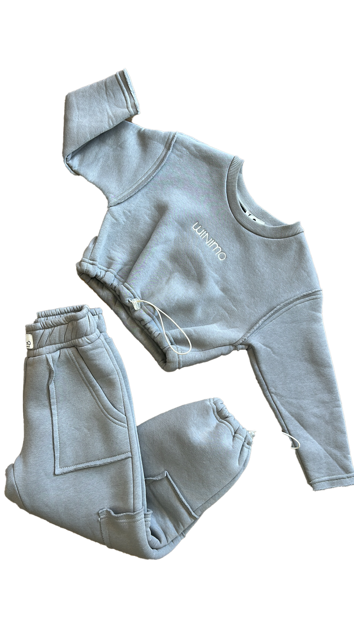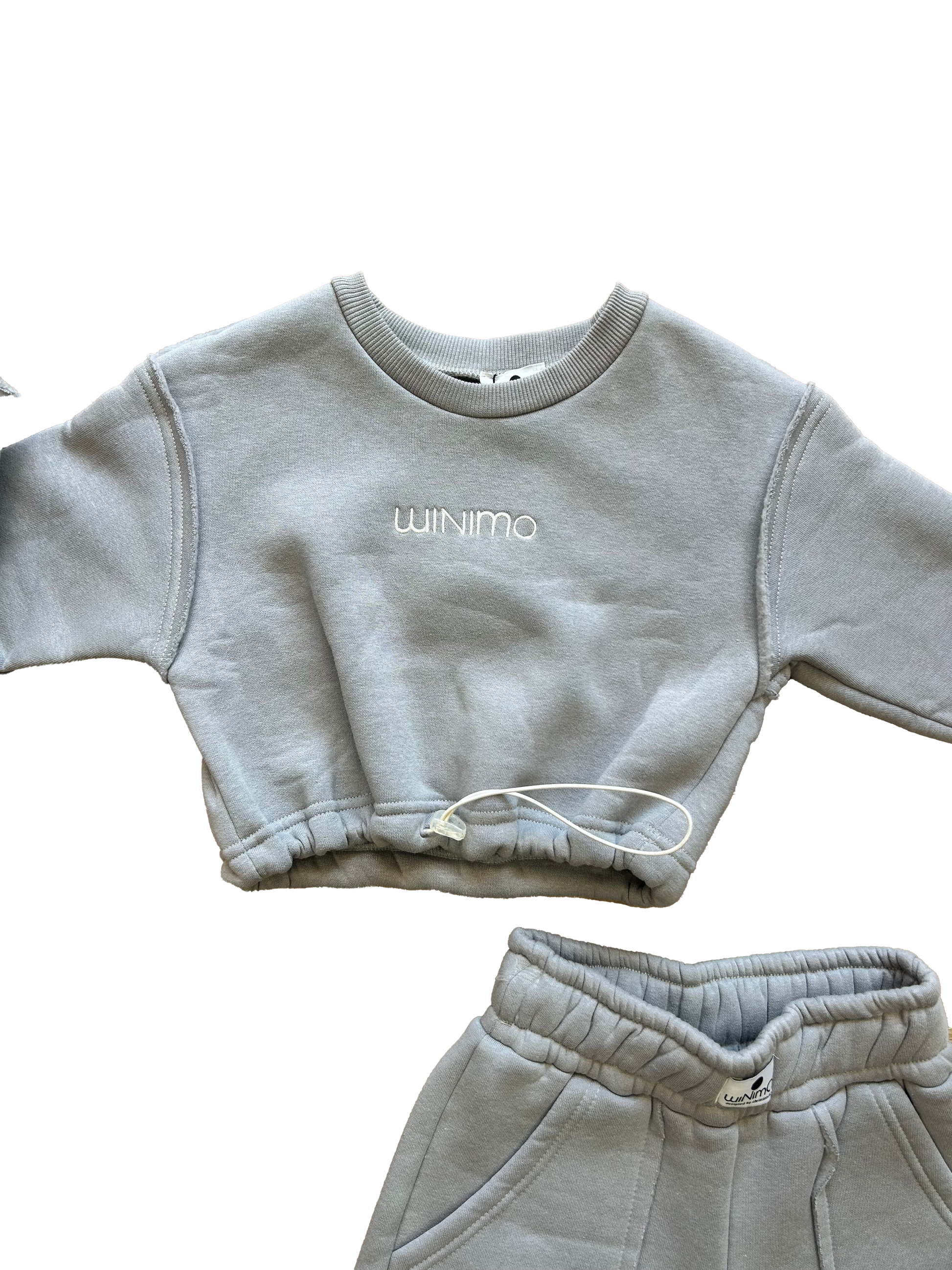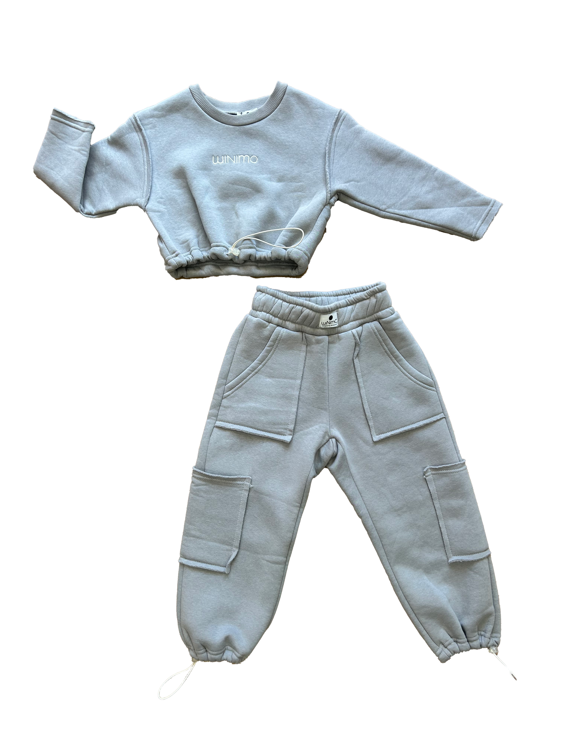 Tuta Minimo grigia completa composta da felpa crop con elastico regolabile sul fondo e logo ricamato sul davanti, abbinata a pantalone over con tasche frontali, tasconi laterali, elastico in vita ed elastico sul fondo regolabile con cursore.
