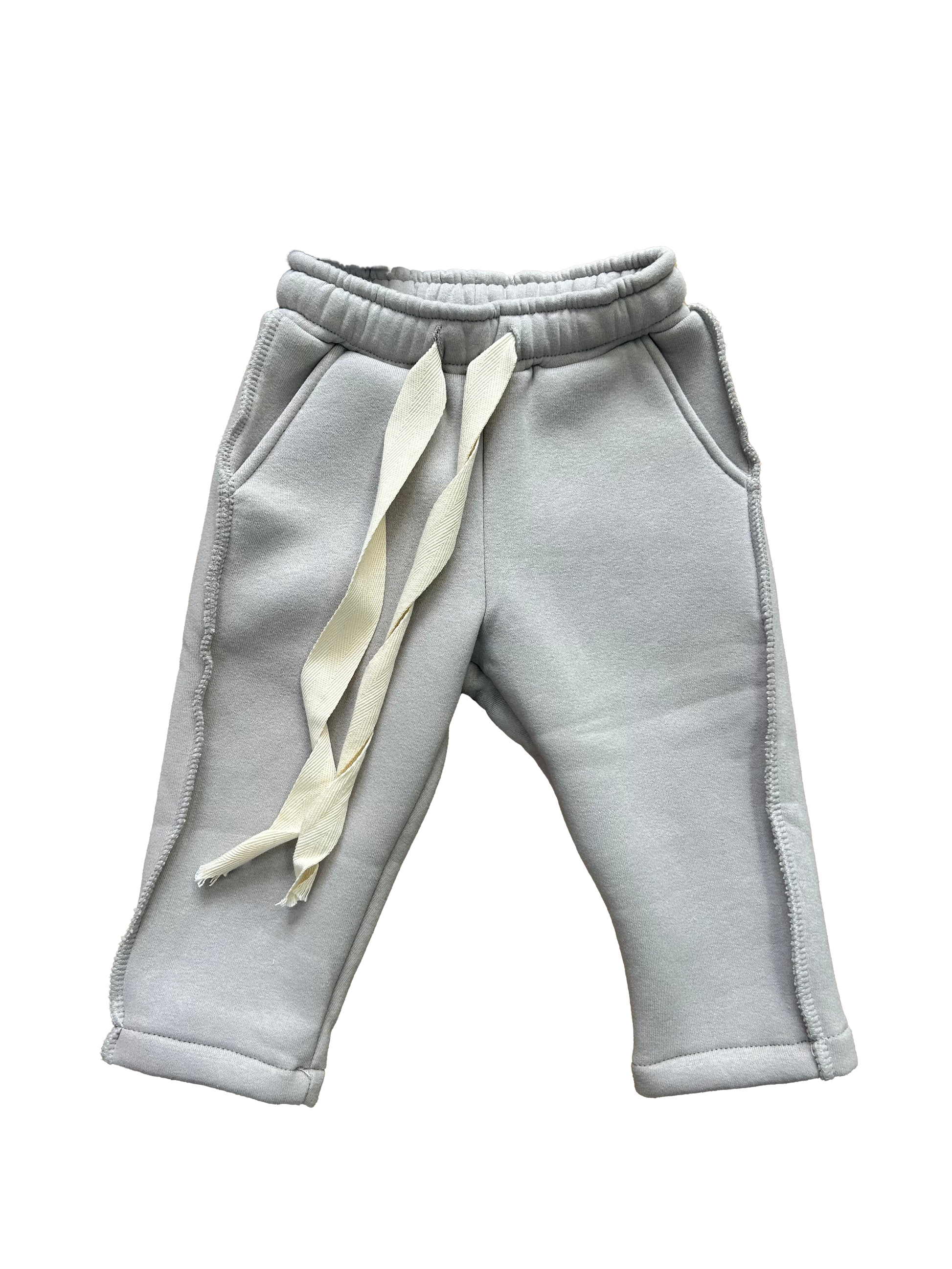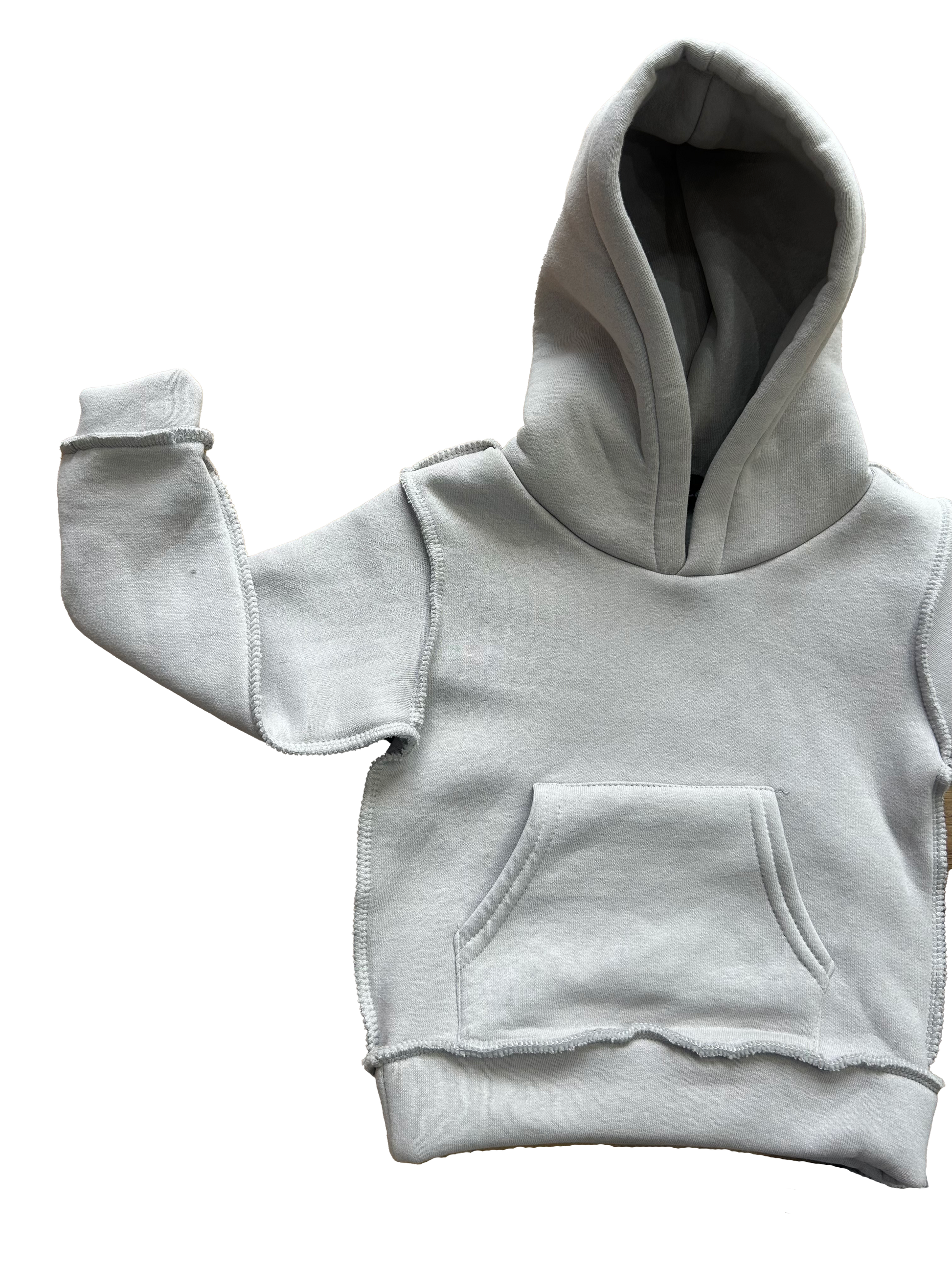 Tuta completa in morbido tessuto felpato, color grigio chiaro, calda e confortevole. Composta da felpa con cappuccio e pantalone senza elastico al fondo, con laccetto regolabile in vita doppio e lungo. Le cuciture a vista donano un tocco originale e moderno, come se il capo fosse indossato al rovescio.