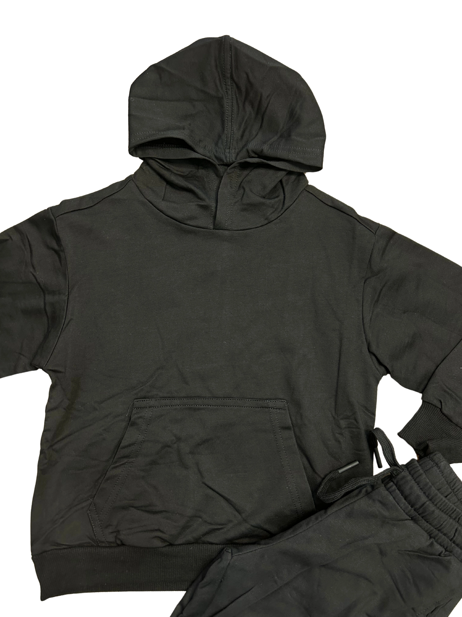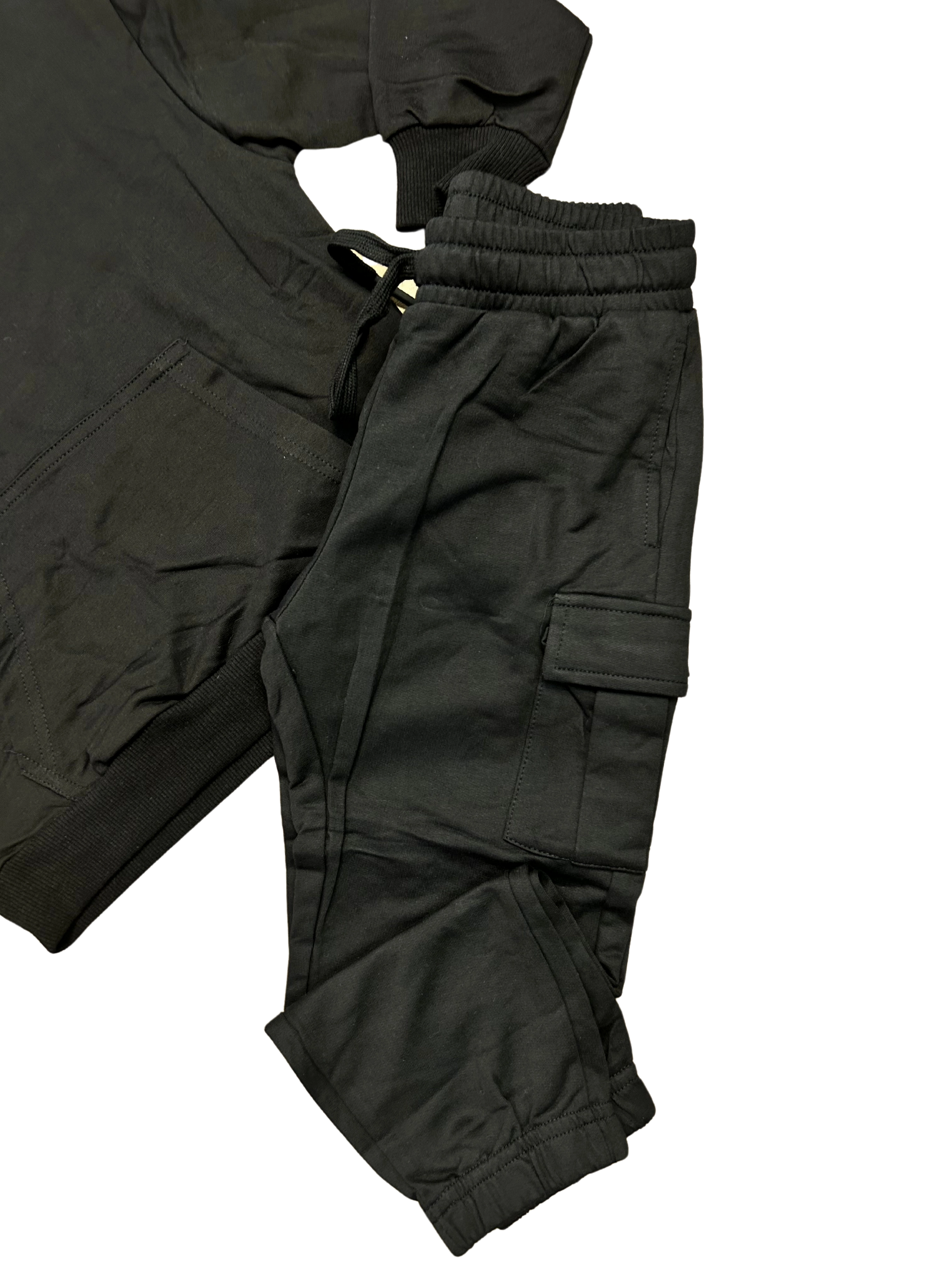 Tuta completa Ativo nera in cotone. Composta da felpa con cappuccio e tascone sul davanti e pantalone modello cargo con tasconi laterali, elastico in vita con laccetto regolabile e elastico sul fondo.