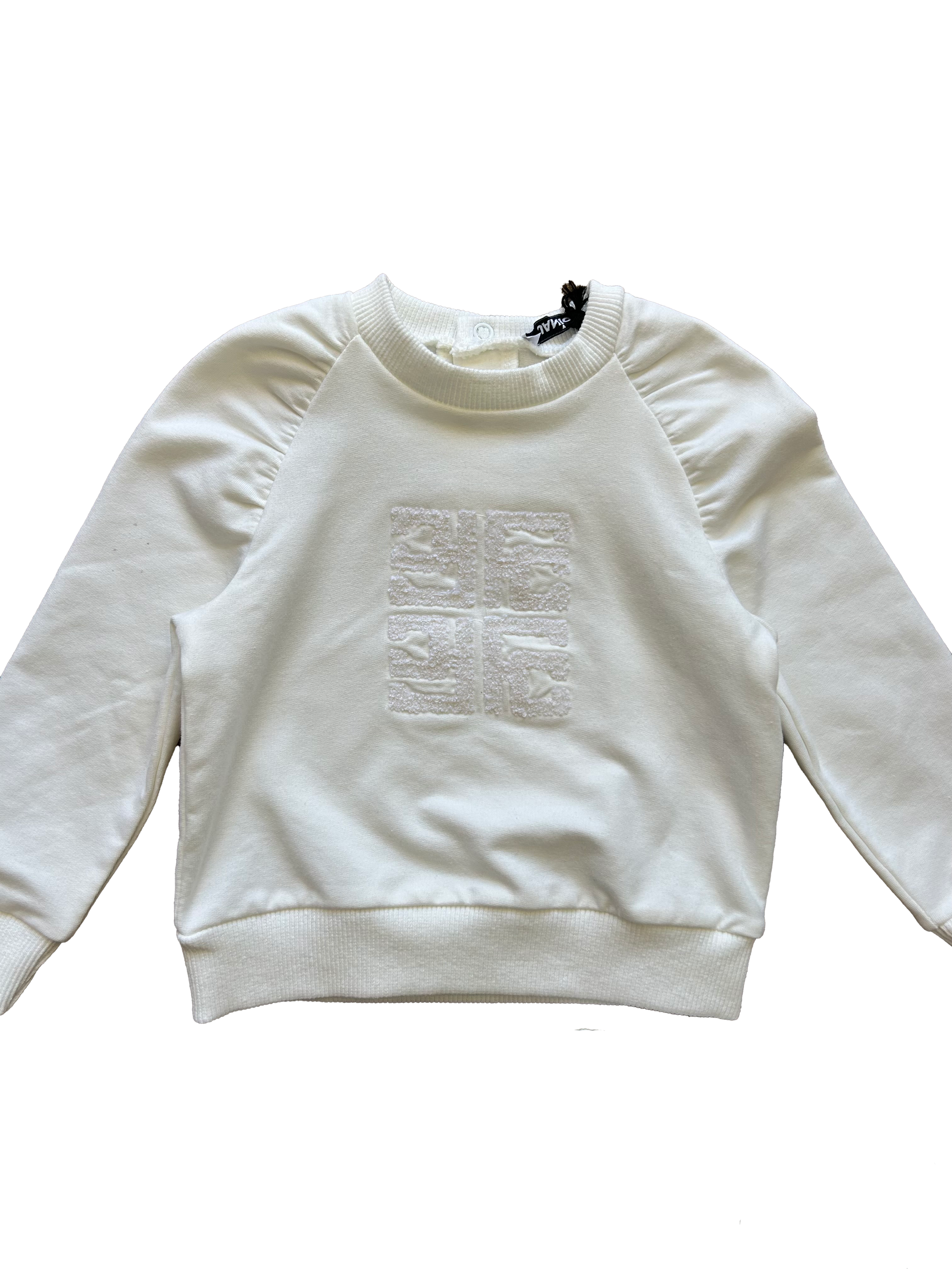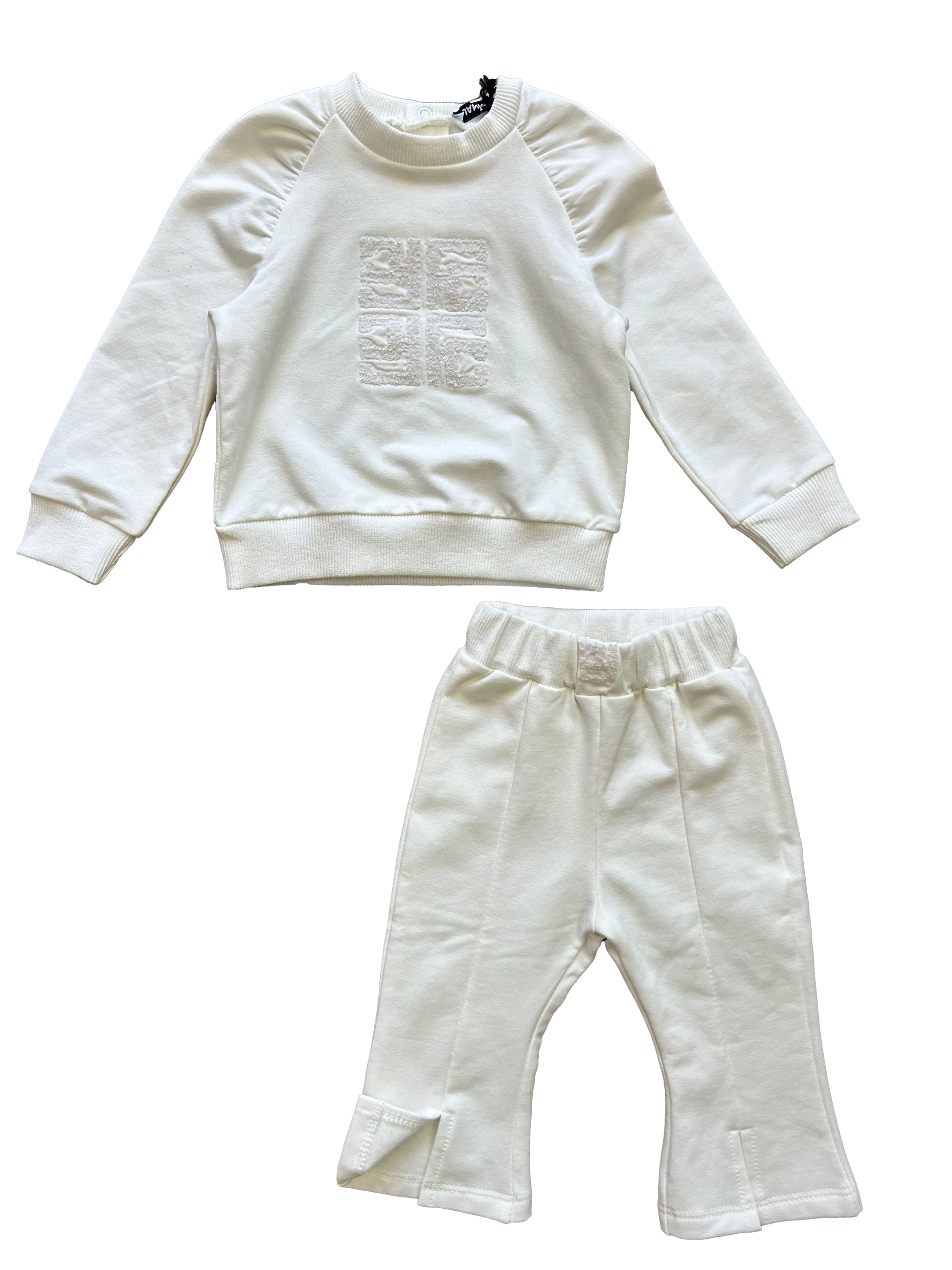 Tuta completa Janice panna, felpata all’interno, composta da felpina girocollo con manica leggermente a sbuffo e logo frontale in teddy, abbinata a pantalone con elastico in vita e modello a zampetta con piccolo spacchetto sul fondo.