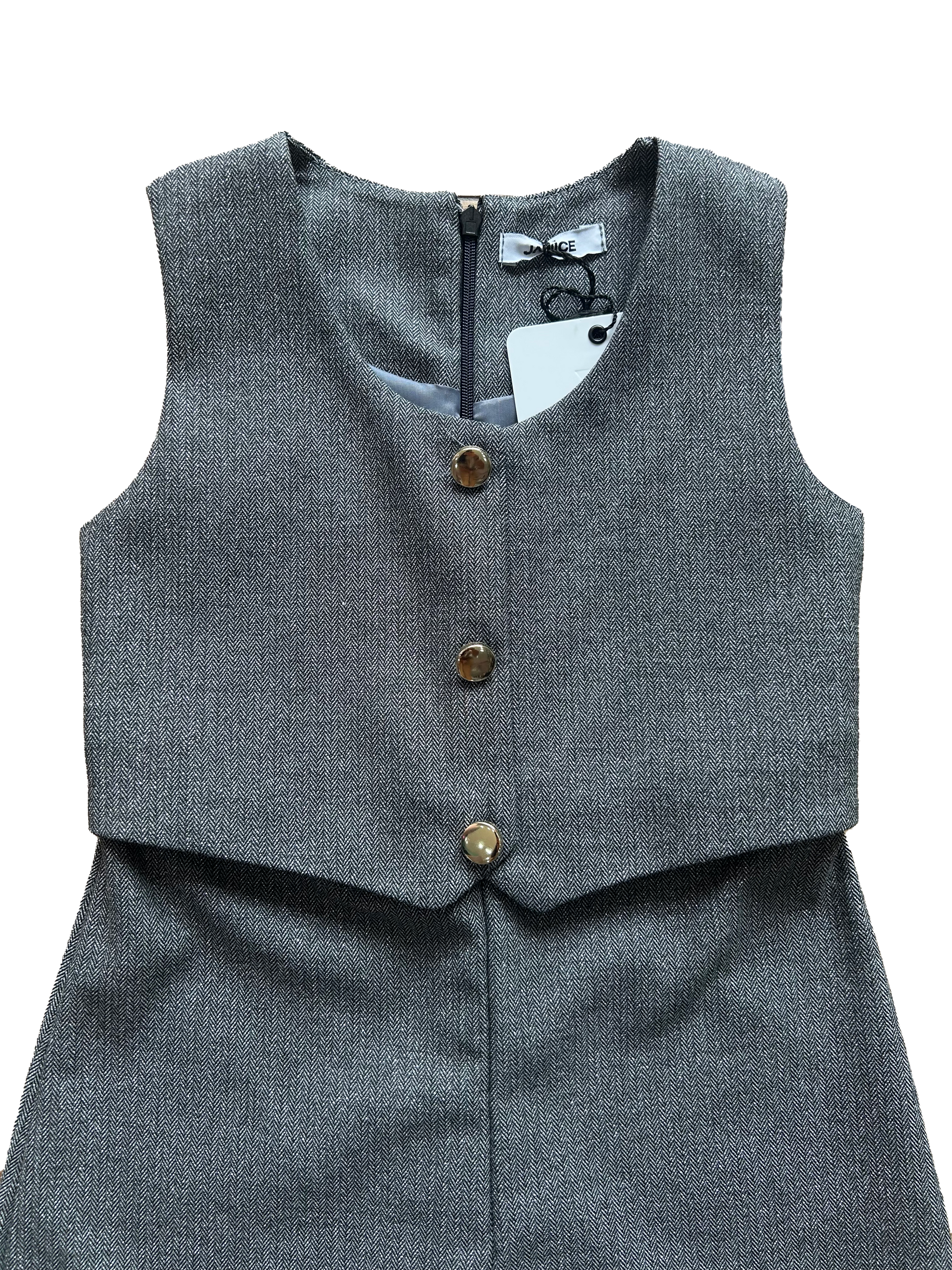 Il corpetto richiama un panciotto con bottoni oro, mentre la cerniera sul retro è a scomparsa per un look elegante e pratico.