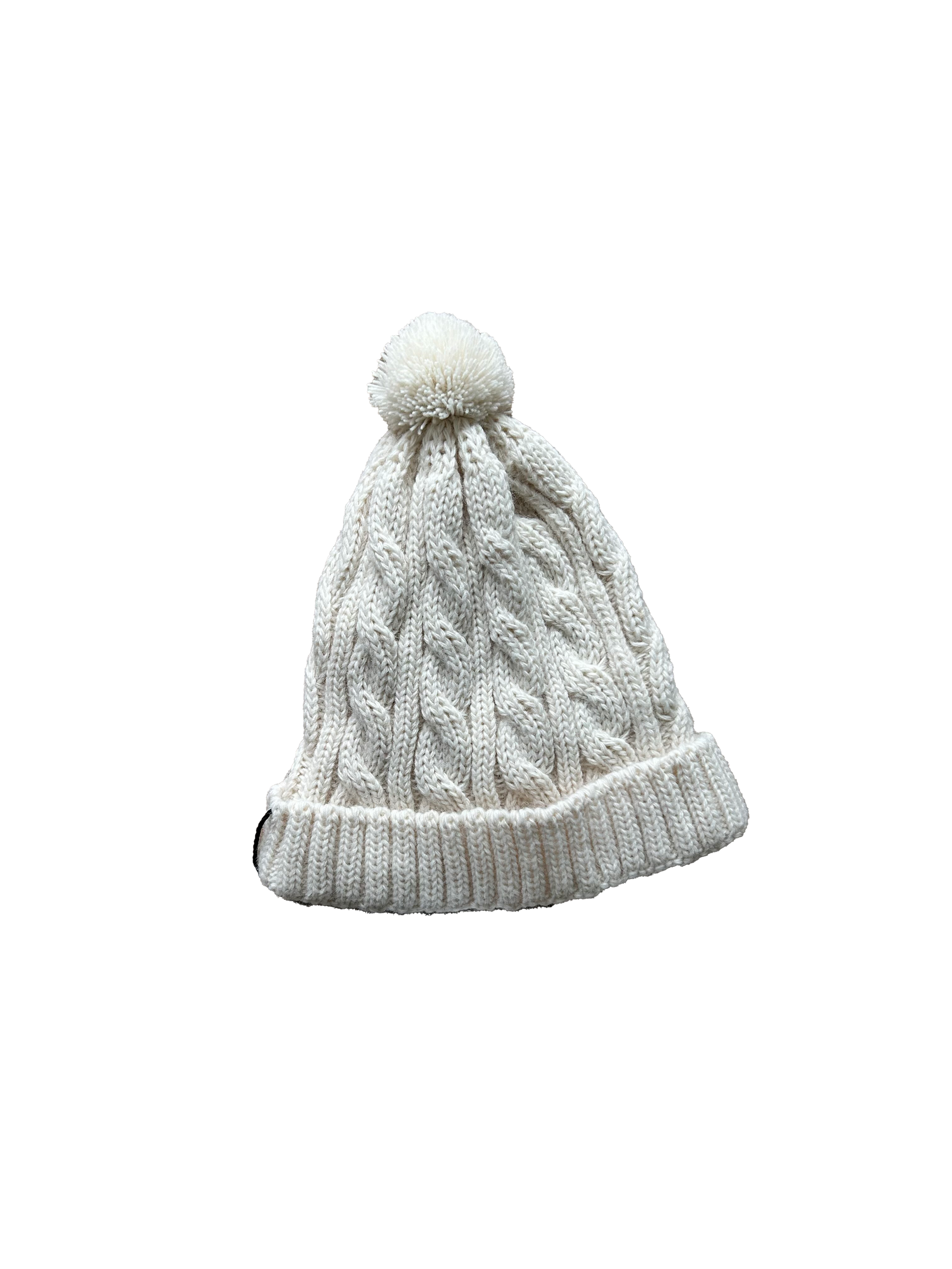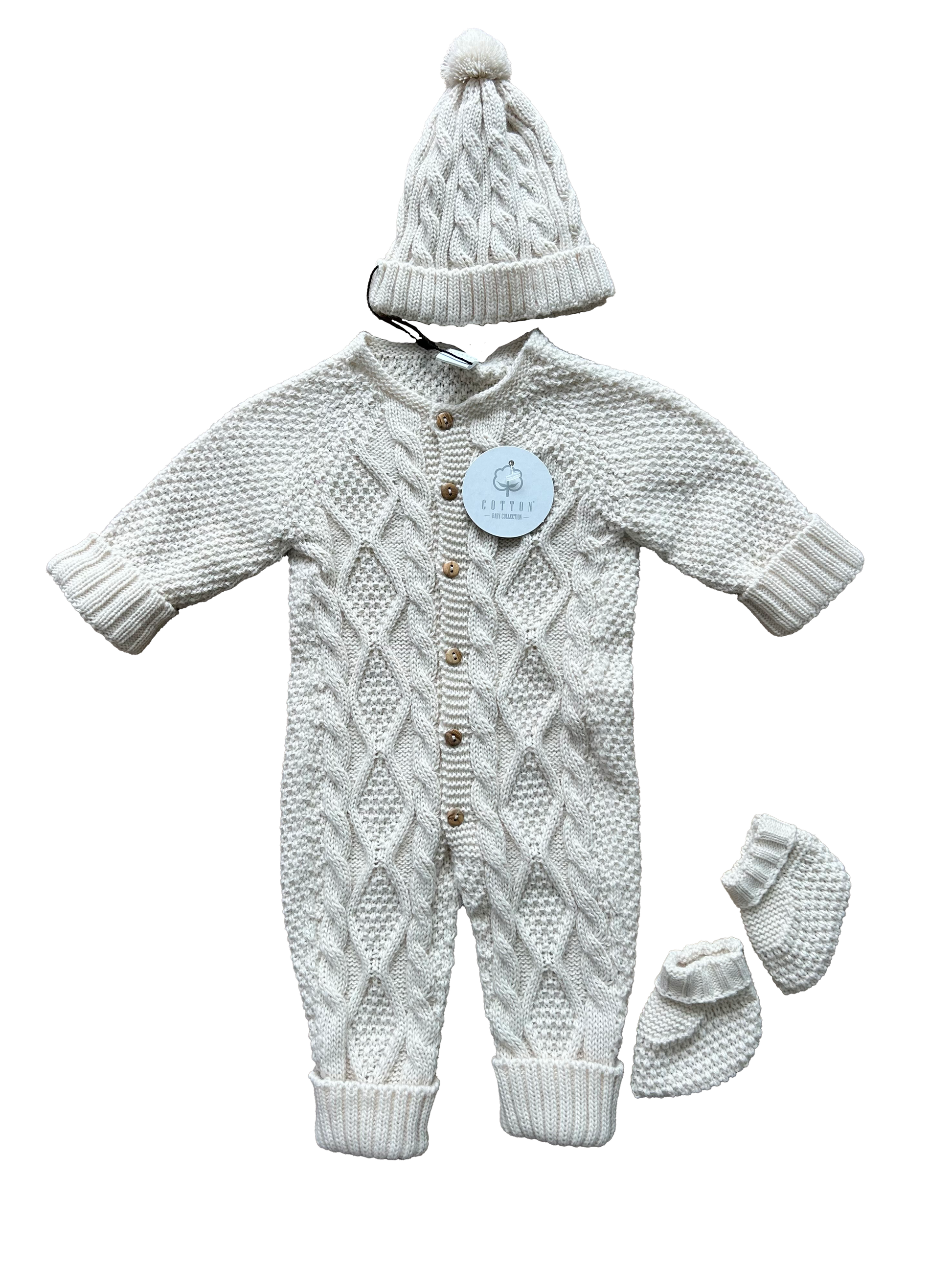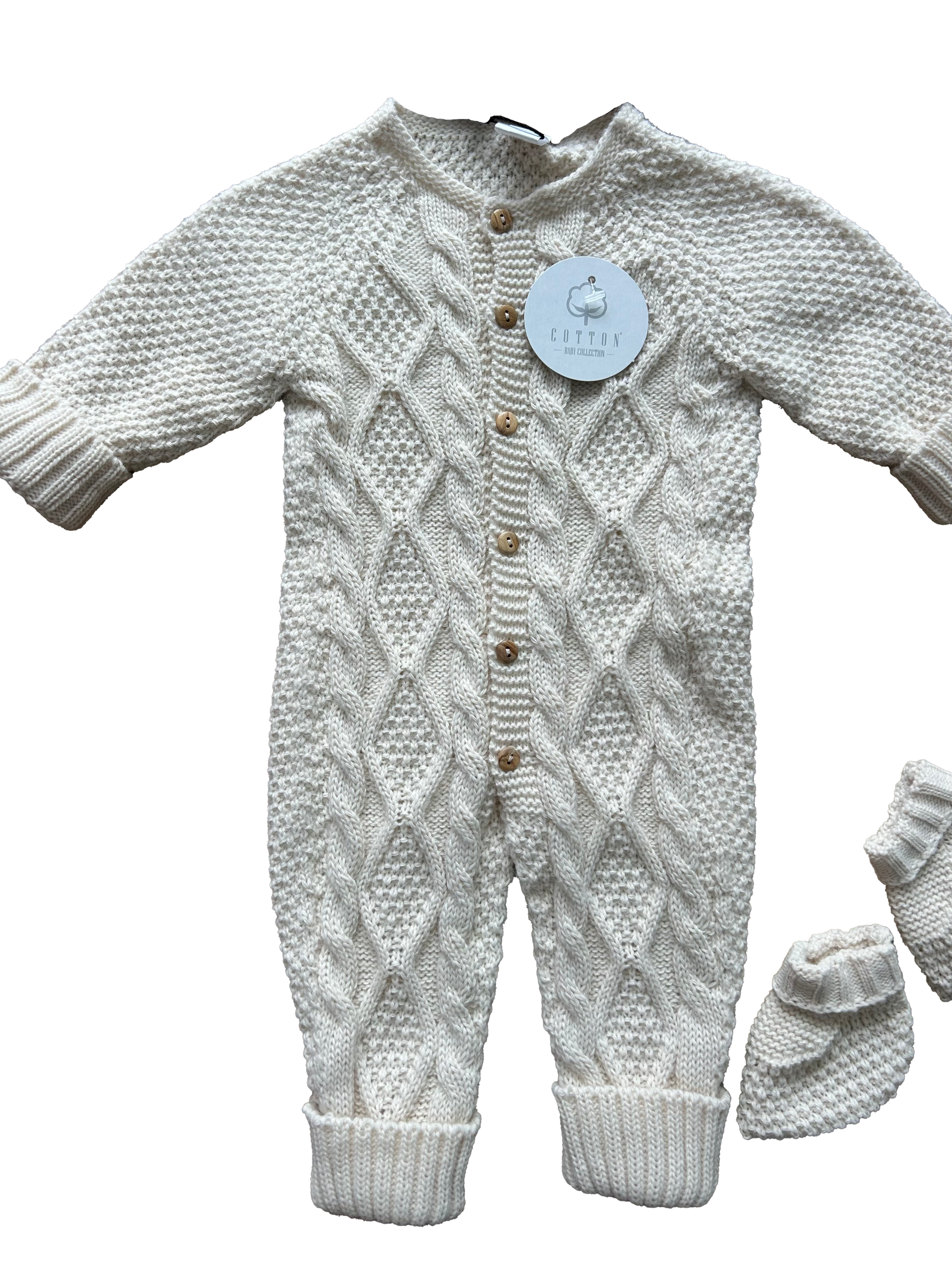 Morbida tutina in maglia beige con elegante lavorazione a treccia, completa di cappellino con pon pon e babbucce abbinate.