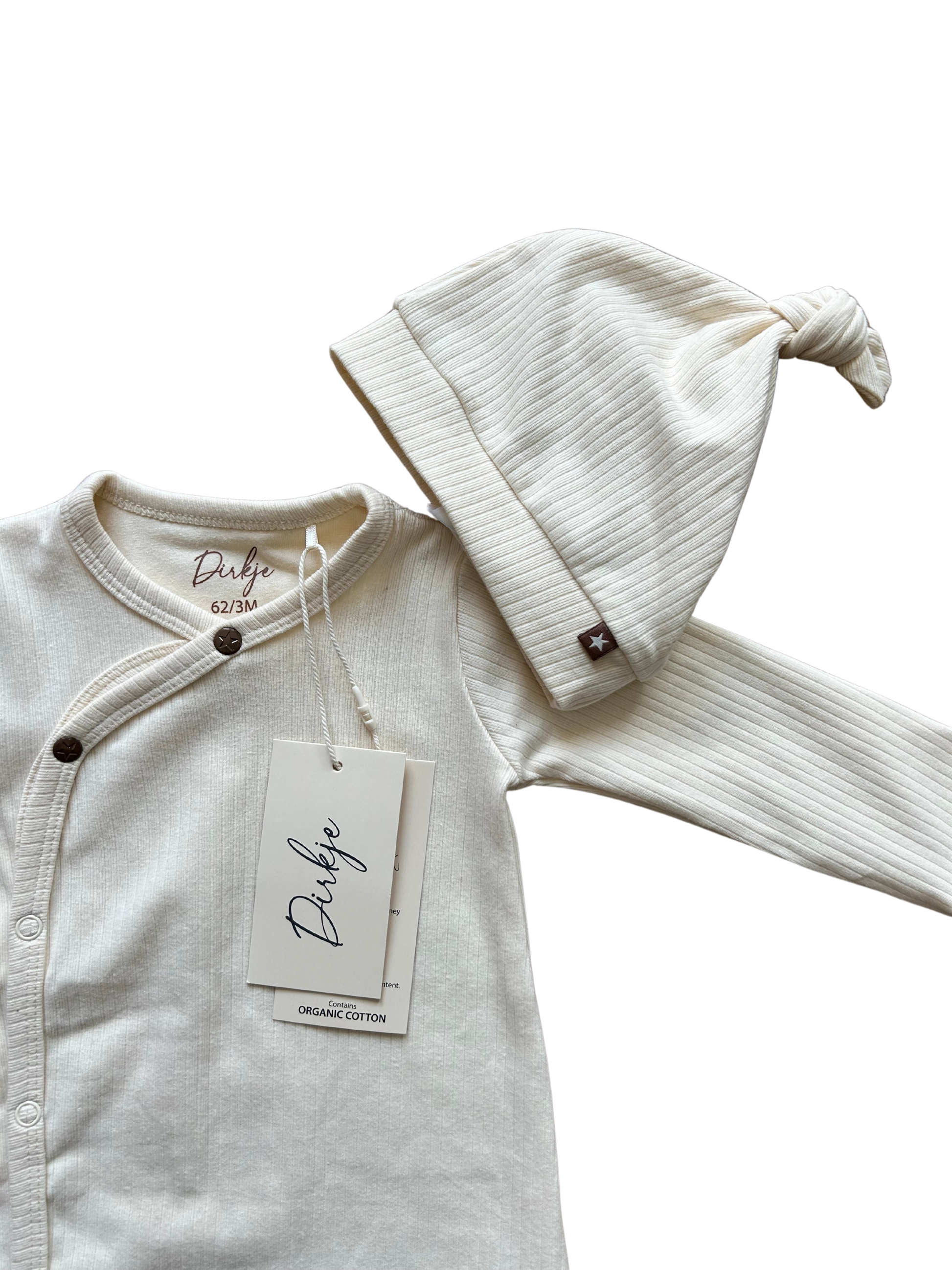 Tutina Dirkje unisex con cappellino in coordinato bianco sporco.